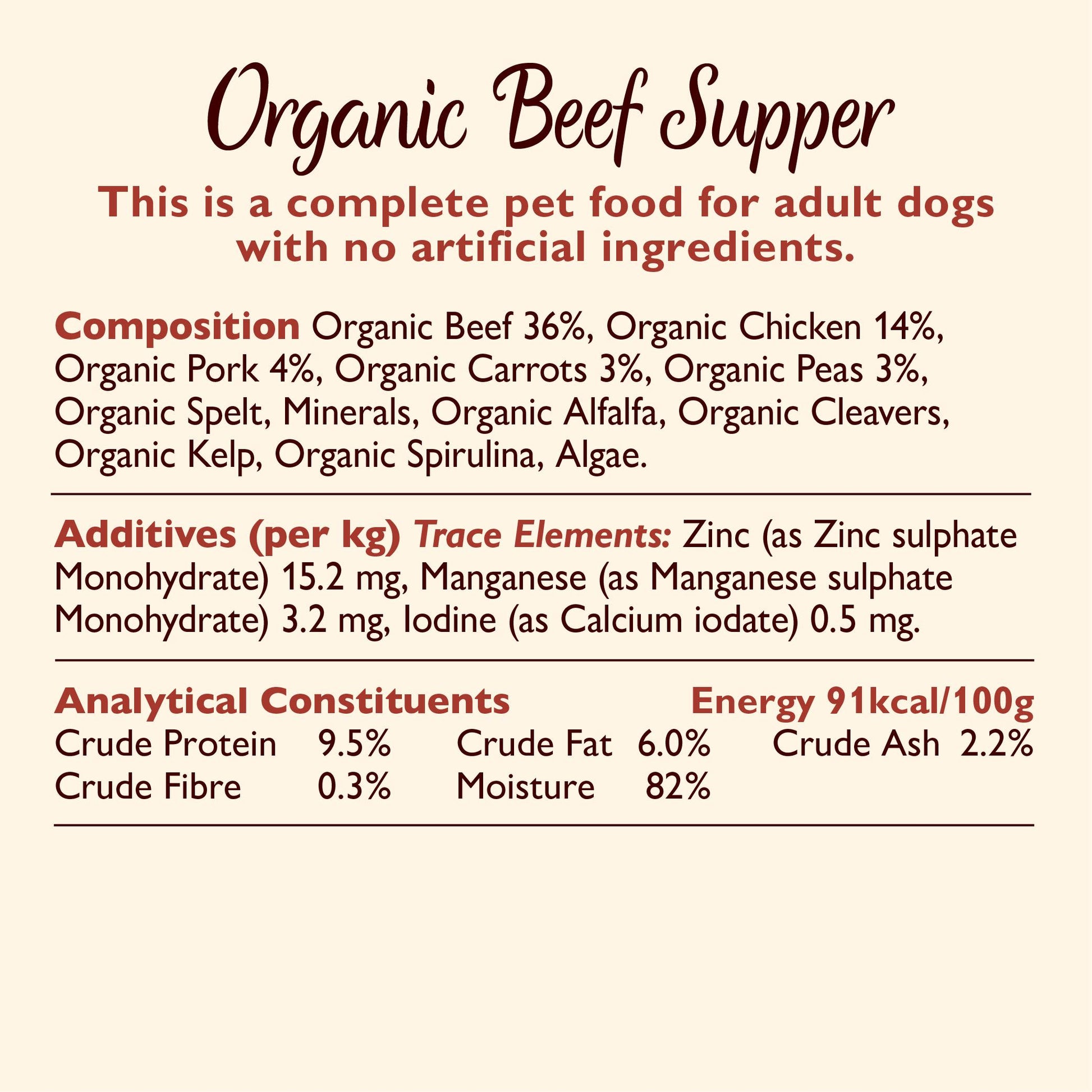 Composition: Beef (36%), chicken (14%), pork (4%),organic vegetables 5% (organic carrots and organic peas), organic spelt, vitamins and chelated minerals, organic alfalfa, organic cleavers, organic kelp, organic spirulina.