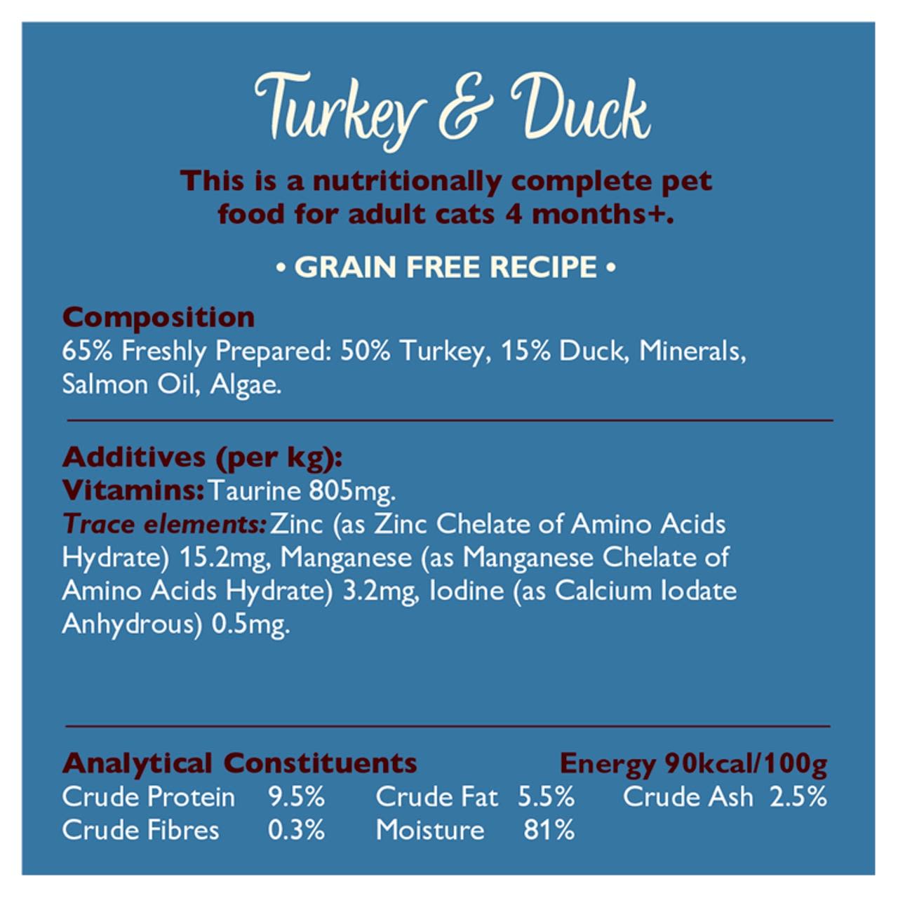 This is a guide only and will depend on your cat's activity level. Food should be served at room temperature. Always ensure your cat has a supply of fresh water. This is a guide only and will depend on your cat's activity level. Nutritionally complete, grain free and natural wet food for adult cats (1 year +).