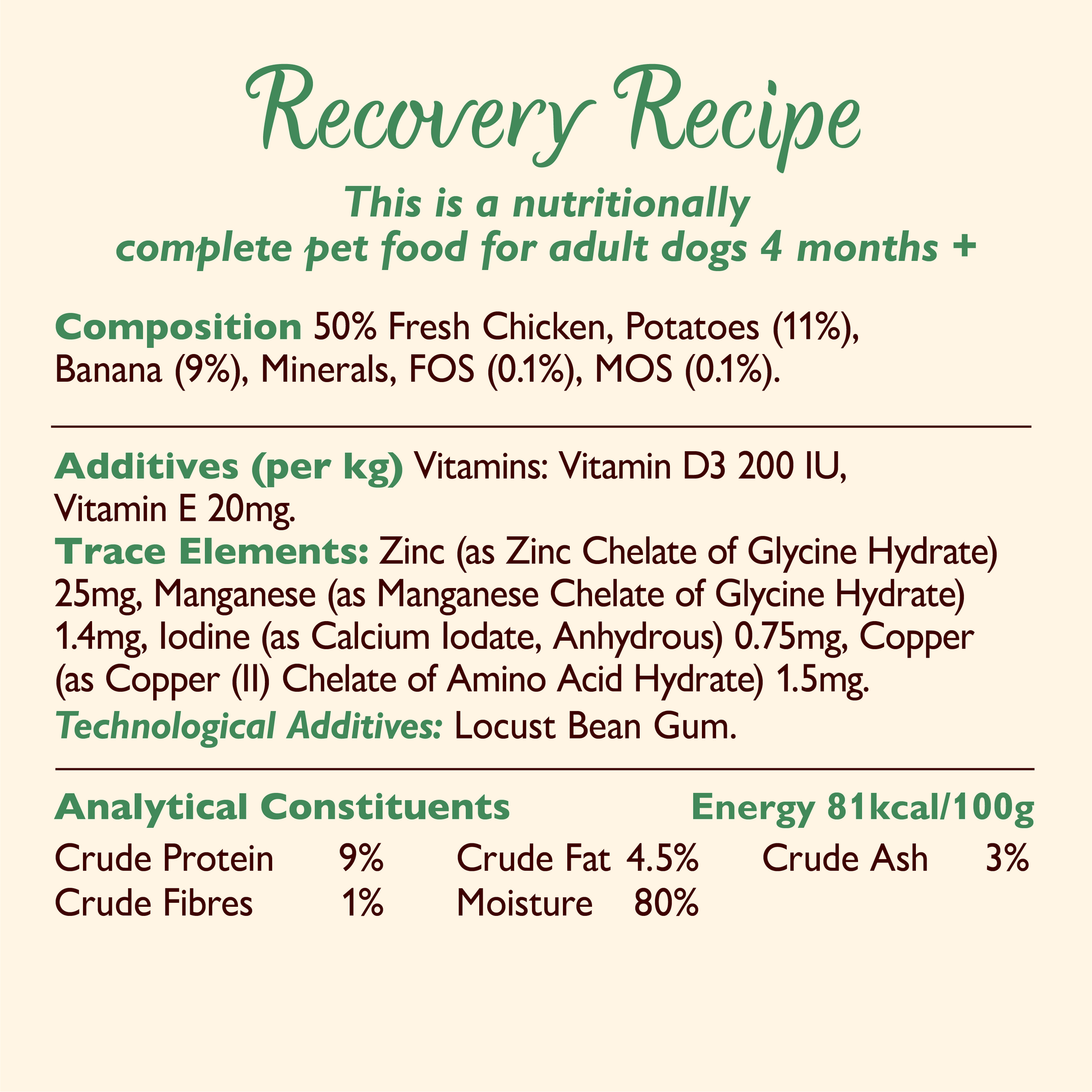 This soothing combination of nutritious ingredients help your dog recover from illness or following an operation. The natural recipe contains fresh chicken, banana and potato, as well as prebiotics to help recover the digestive track and maintain good transit into the intestines. The natural prebiotics FOS from plants helps stimulate the growth of beneficial bacteria. Along with natural prebiotics MOS from yeasts it maintains a live and healthy digestive system, avoiding upset stomachs.