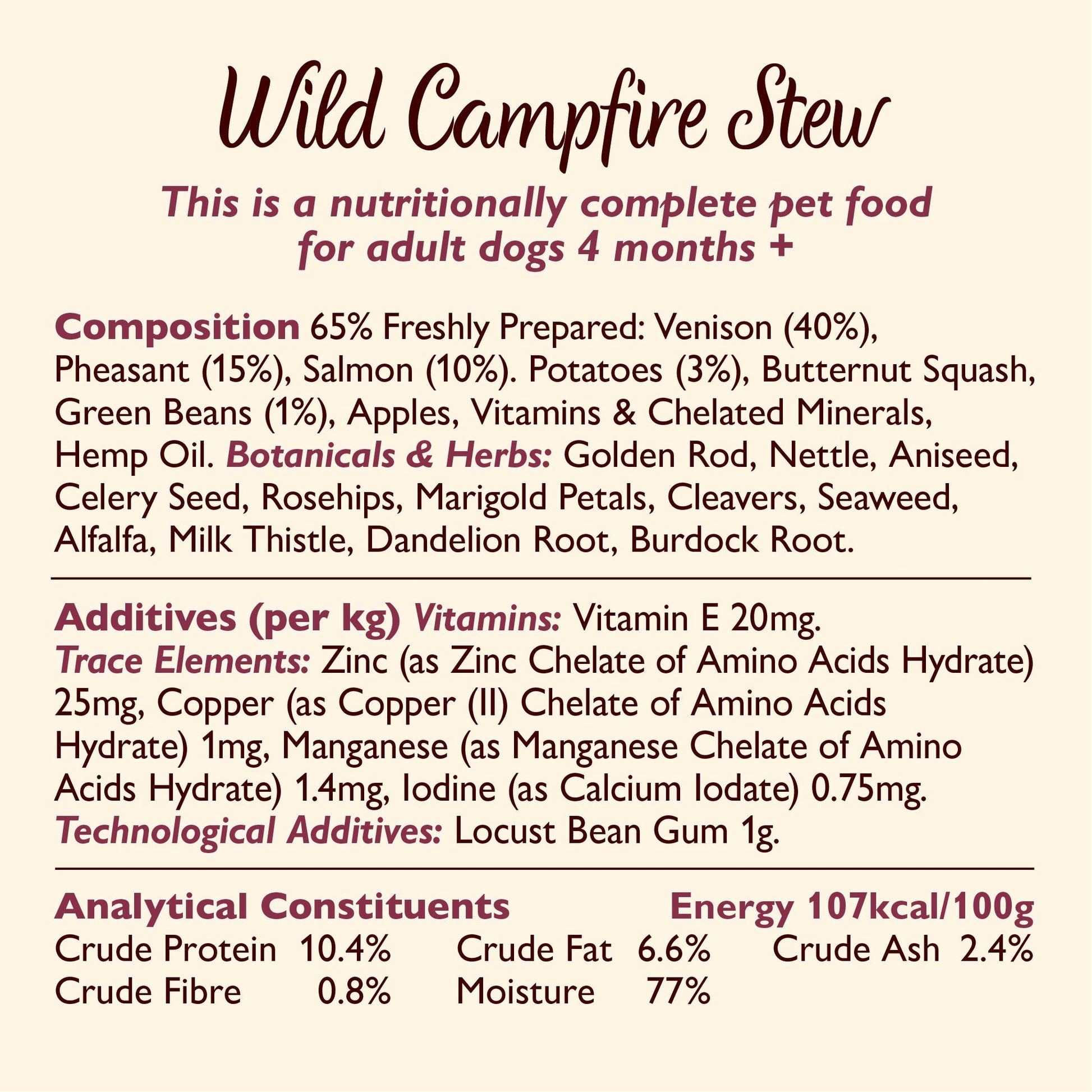 An irresistible grain free, complete recipe made with freshly prepared venison, pheasant and salmon and could be an alternative choice for dogs that may be allergic to the traditional protein sources or have sensitivities. It’s made with freshly prepared venison, pheasant and salmon. Each scrumptious serving is packed full of wholesome, tasty vegetables - potatoes (a source of potassium) and butternut squash (contains Vitamins A & C). We also add in our unique blend of healthy herbs to give your dog some extra goodness in their meal.
