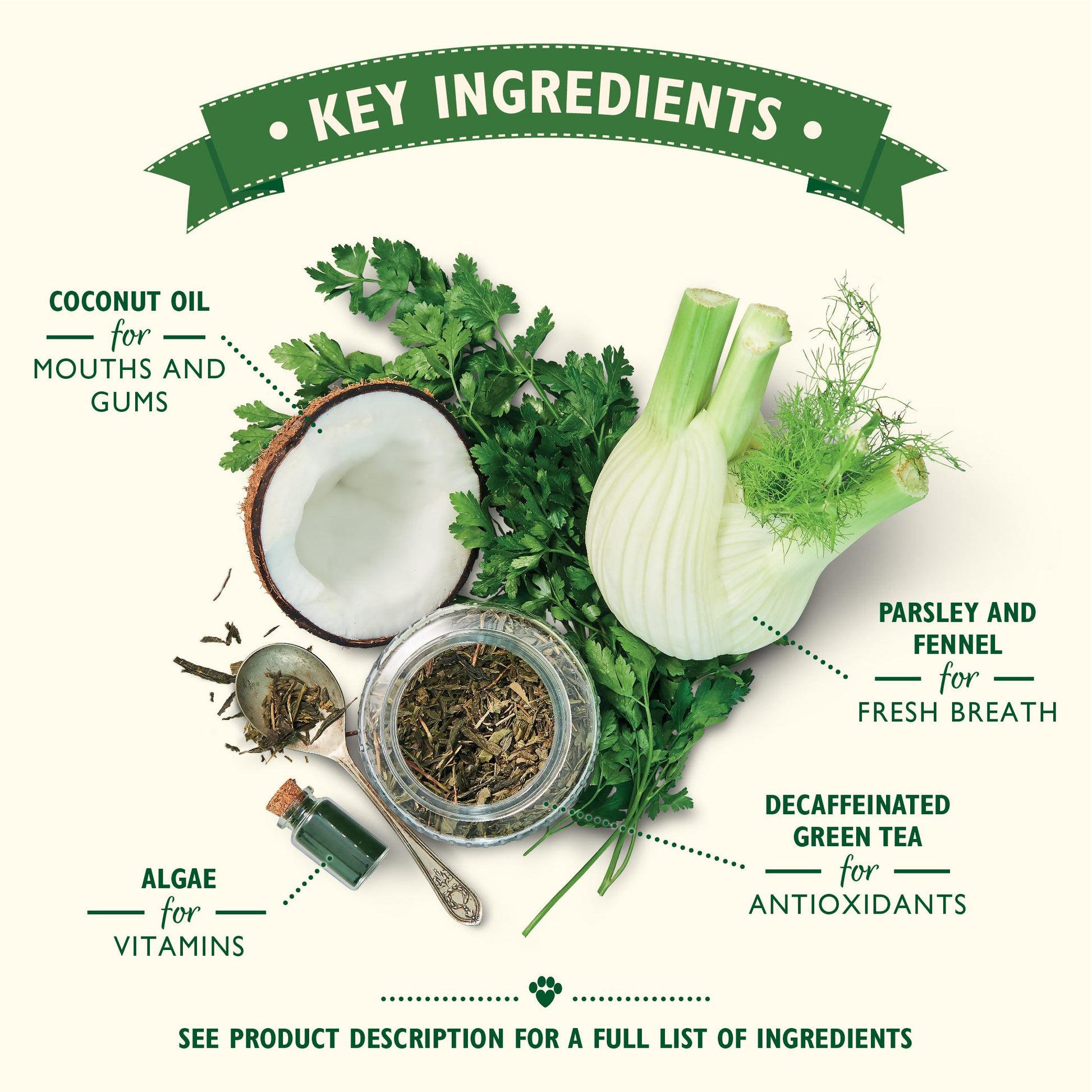 Woofbrush is a dental chew with a difference. Thanks to its clever spongey texture, this chew gets right down to the gumline to wipe away plaque - and it's all thanks to natural ingredients. We believe all pets deserve proper food, and that's still true when it comes to dental chews. Because dogs eat their ‘toothbrush and toothpaste' (their dental chew), it's important that their chew is as kind to their tummy as it is to their teeth. Woofbrush has been carefully crafted with help from our pet dental expert to make sure it works brilliantly, and uses top notch natural like parsley, coconut oil and fennel for a proper clean without the added nonsense. What's more, dogs absolutely adore the taste. From extensive feeding trials to the reactions of the office dogs whenever someone opens a packet, we know the Woofbrush is a chew that's a treat not a chore.We recommend brushing teeth daily but if this is not an option a Woofbrush a day is a good alternative and will help support your dog's dental health. This pack of 7 dental chews is just right for small dogs to have one each day of the week.