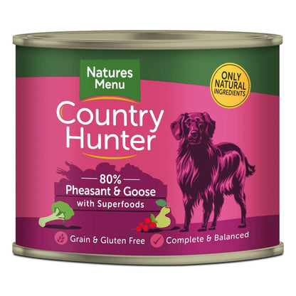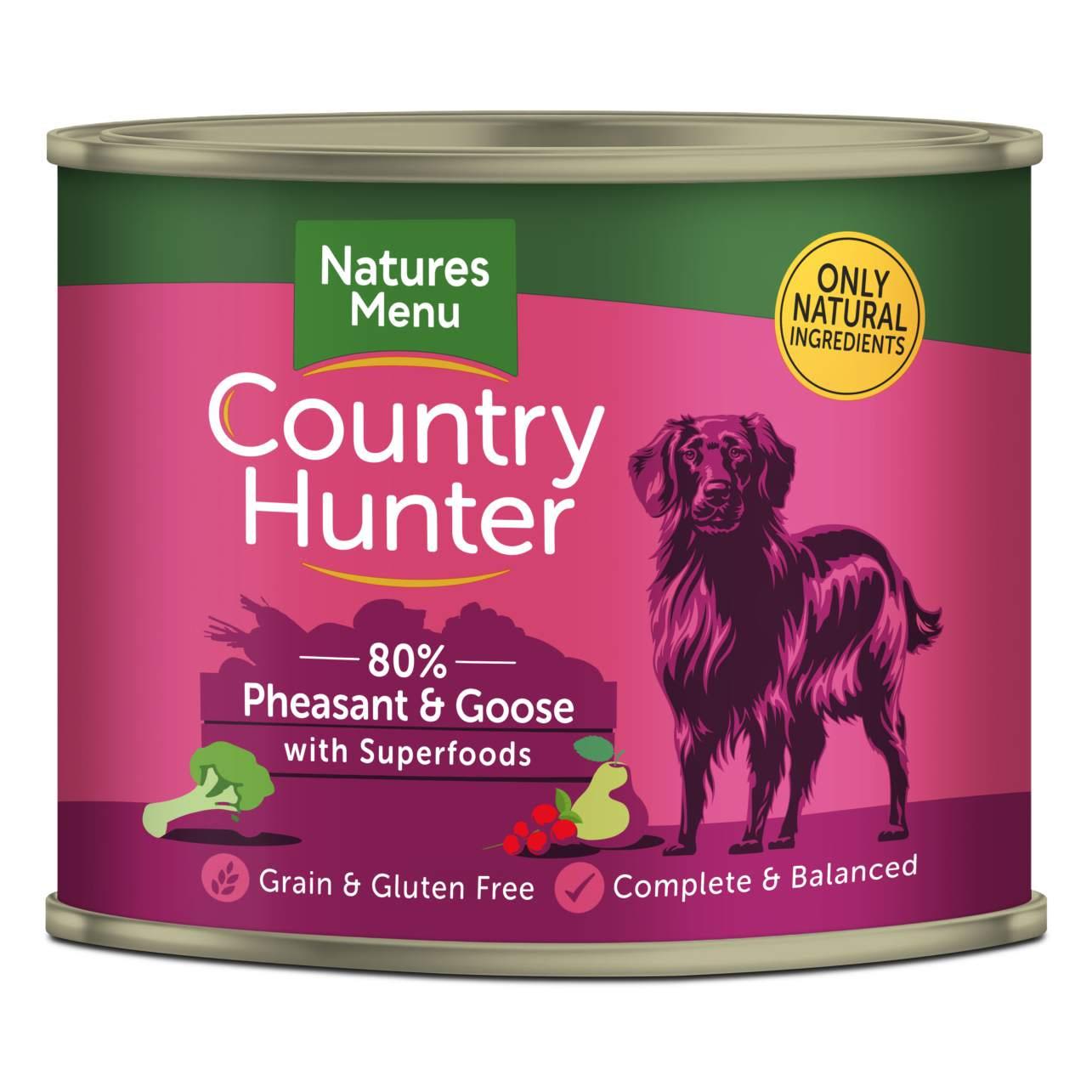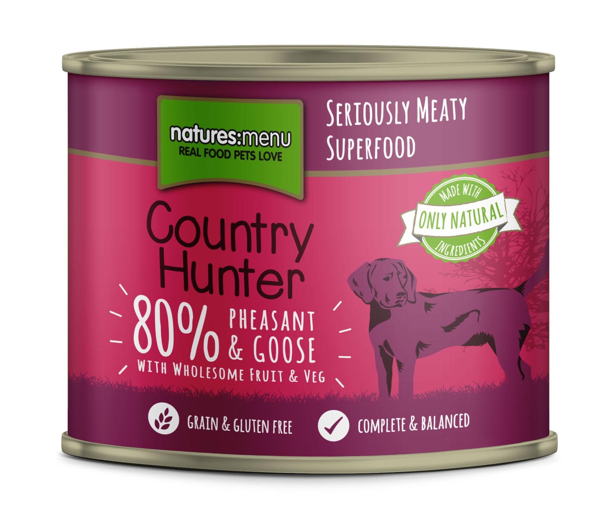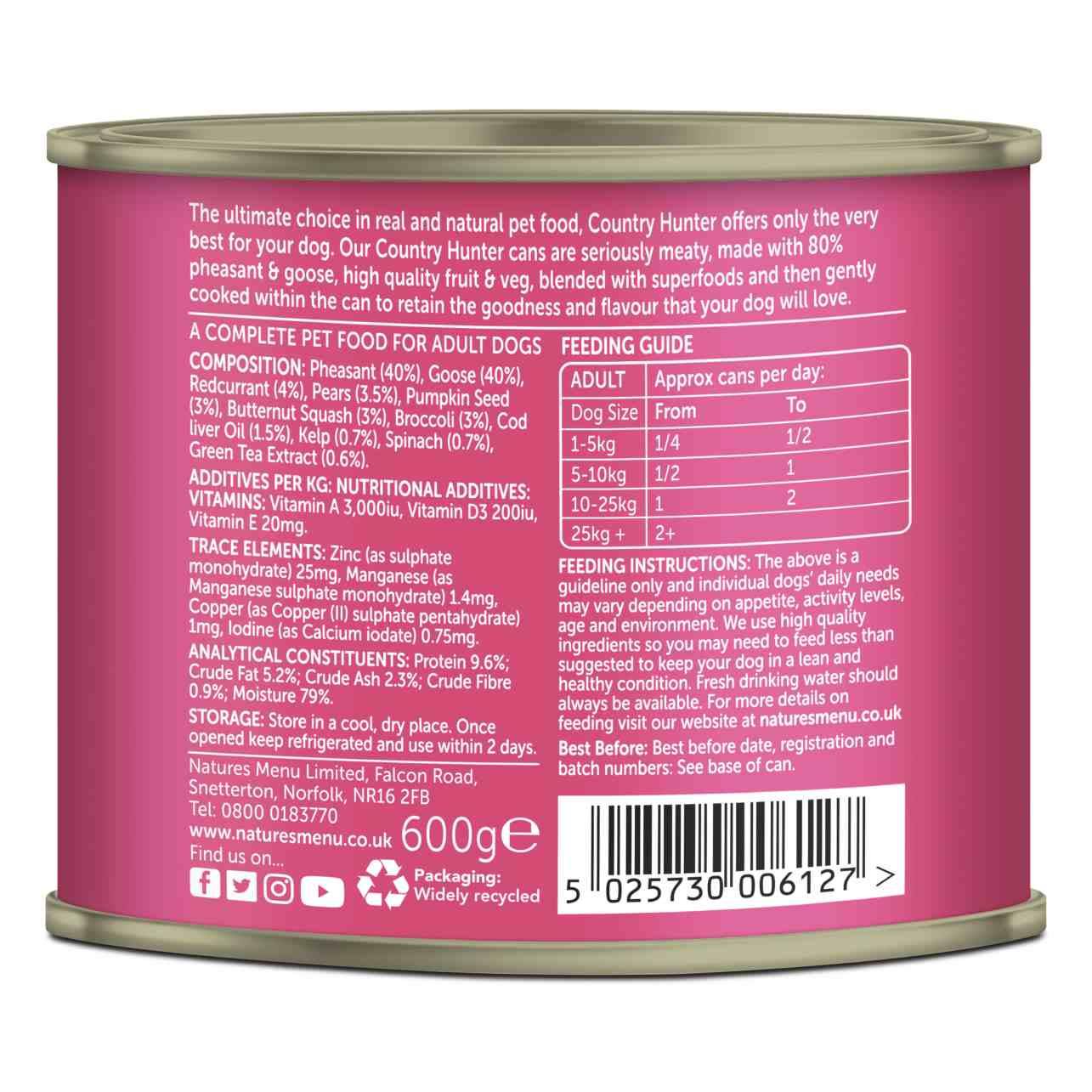 A complete and balanced meal with deliciously meaty cuts of Pheasant and Goose and a wholesome blend of red berries, nutritious pumpkin seeds and autumnal vegetables.Our premium Country Hunter canned meals for dogs are filled with top quality raw ingredients, sealed and then steam cooked to lock in goodness.A complete and nutritionally balanced meal packed with ethically sourced, human grade meats, scrumptious fruit and veg plus essential vitamins and minerals.