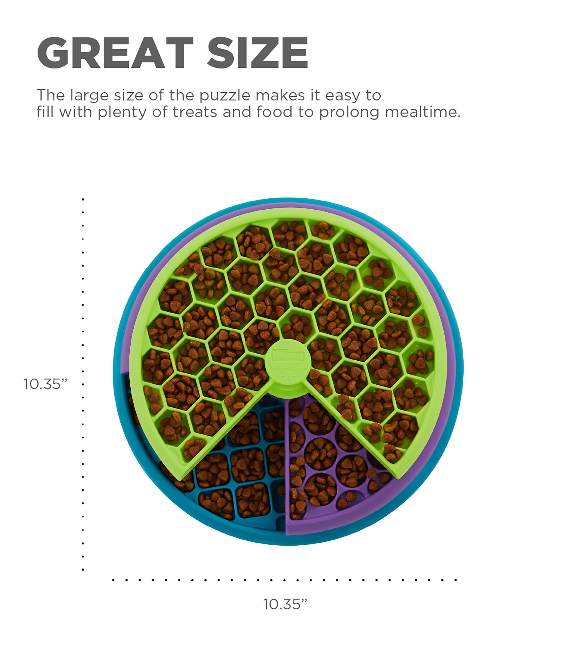3 layers of snack spinnin' fun: Dogs will have to use their problem-solving skills to spin each layer in order to find the hidden treats. Level 2 enrichment game: Dog puzzle games help pups use their natural instincts and behaviors to help their brains develop through mental stimulation. Fights boredom: Dog puzzle games like Lickin' Layer keep dogs busy while they work to reveal the hidden rewards. Improves digestion: Use as a slow feeder! The mazes on ridges on each layer force your dog to eat at a safer, healthier pace. Play it safe: No toy is indestructible. Do not leave toys with unsupervised pets. Remove and replace toy if damaged. Lickin layers dog puzzle game food slow feeder treat puzzle mental stimulation enrichment nina ottosson outward hound.
