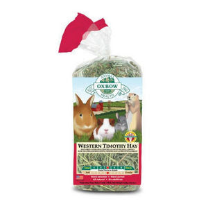 Oxbow Western Timothy Hay is a fresh grass hay suitable for adult rabbits, guinea pigs, chinchillas and other small animals How it works This tasty hay is rich in high quality nutrition that helps to keep the gastrointestinal tract of small herbivores functioning properly. It is a long strand fibre source, with low protein and low calcium content, perfect for keeping your small animal’s hunger at bay. Key benefits long strands for your furry friend to nibble on balanced nutrition helps to maintain health sweet smelling When to use it Grass hay is a large part of a small animal diet. Fresh, dust free hay should be provided as bedding as well as something for your small animal to nibble. Variety is always good and adding fresh portions throughout the day will keep your furry friend happy.