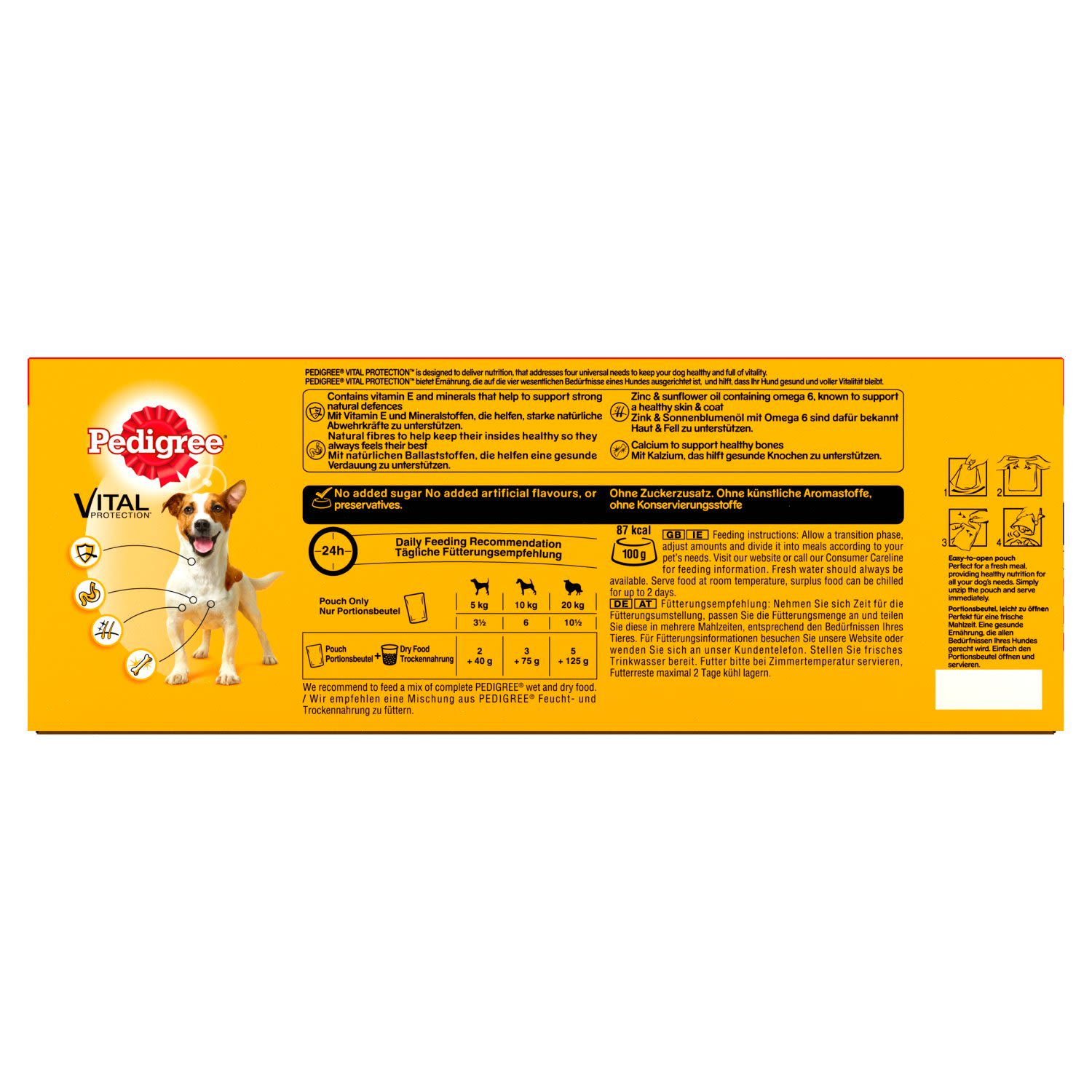 Complete Wet Pet Food for Adult Dogs. Nutrition for dogs that helps support healthy bones, good digestion, a healthy skin & coat and strong natural defences. 100% complete and balanced, Pedigree Wet dog food is not only nutritious but also makes for highly enjoyable everyday meals that will bring out their infectious enthusiasm. In its easy-to-open Pouch format, it's perfect for a fresh healthy meal you can serve in one go. Developed with the help of vets and nutritionists at Waltham Pet Nutrition Centre, Pedigree dog food pouches have all the essential nutrients to support optimal digestion, a healthy skin and coat, strong natural defences and healthy bones. Pedigree dog Pouches contain no artificial colourants, flavours or preservatives. 100% Complete and delicious wet dog food for adult dogs, Easy-to-open pouches, perfect for a fresh healthy meal, on its own or on top of dry dog food, Dog food developed with our vets and nutritionists at Waltham Pet Nutrition Centre, This pet food contains no artificial colours, flavours or preservatives. Pedigree® offer a complete range of tasty and wholesome dog food and dog treats. 100% Complete and Balanced pet food. 40 x 100g Pedigree wet dog food for Adult dogs. Pedigree dog food pouches in gravy. Dog food contains no artificial colours, flavours or preservatives.Easy-to-open pouch Perfect for a fresh meal, providing healthy nutrition for all your dog's needs. Simply unzip the pouch and serve immediately.