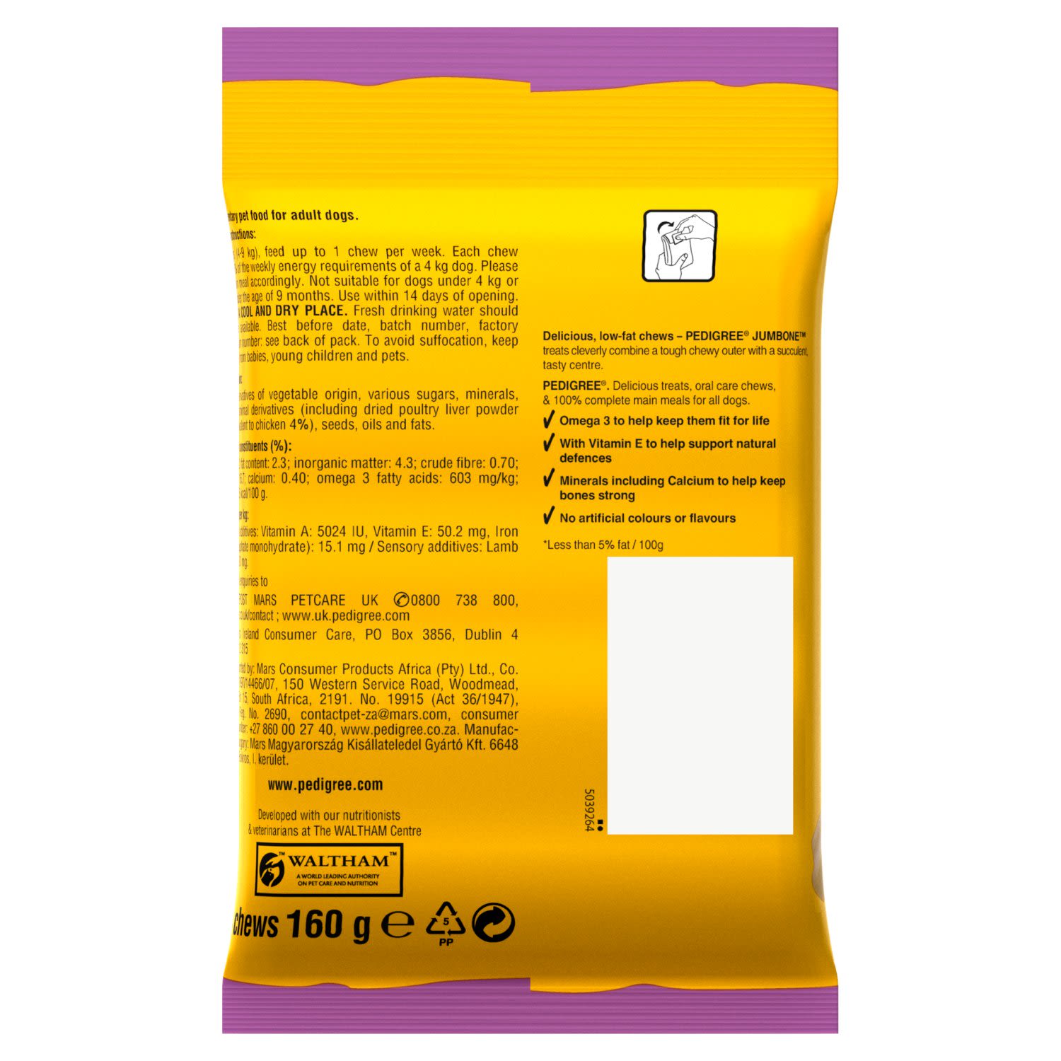 Delicious, low-fat dog treat chews Pedigree® Jumbone treats cleverly combine a tough chewy outer with a succulent, tasty centre.