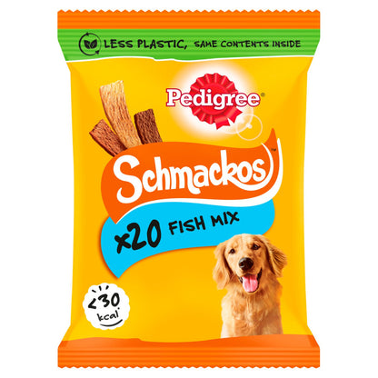 Delicious Tender Strips Pedigree Schmackos treats for dogs are soft, succulent treats, full of delicious flavours that dogs adore. 20 tasty dog treat strips in Tuna, Salmon & Cod flavours Dog training treats with Omega 6 to help keep them fit for life Dog treats for training with Vitamin E to help support natural defences Treats for dogs with minerals including Calcium to help keep bones strong Fish dog treats and salmon dog treats with no artificial colours or flavours.