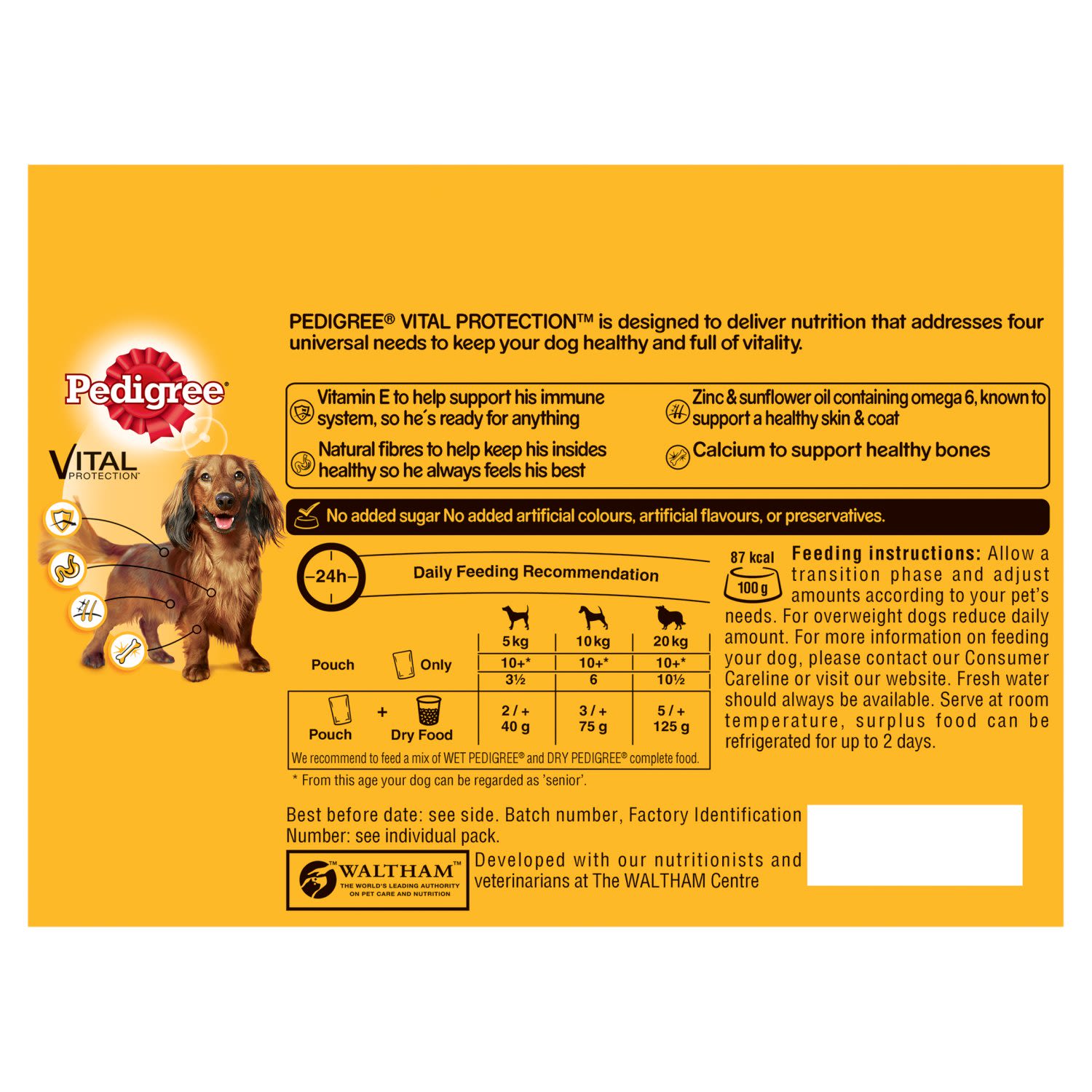 Developed with the help of vets and nutritionists at Waltham Pet Nutrition Centre, Pedigree senior dog food pouches have all the essential nutrients to support optimal digestion, a healthy skin and coat, strong natural defences and healthy bones. 100% complete and balanced, Pedigree wet dog food is not only nutritious but also makes for highly enjoyable everyday dog pouch meals that will bring out their infectious enthusiasm. In its easy-to-open Pouch format, this wet food for dogs is perfect for a fresh healthy meal you can serve in one go. 12 x 100g Pedigree wet dog food pouches in jelly for senior dogs with no artificial colorants, flavours or preservatives.