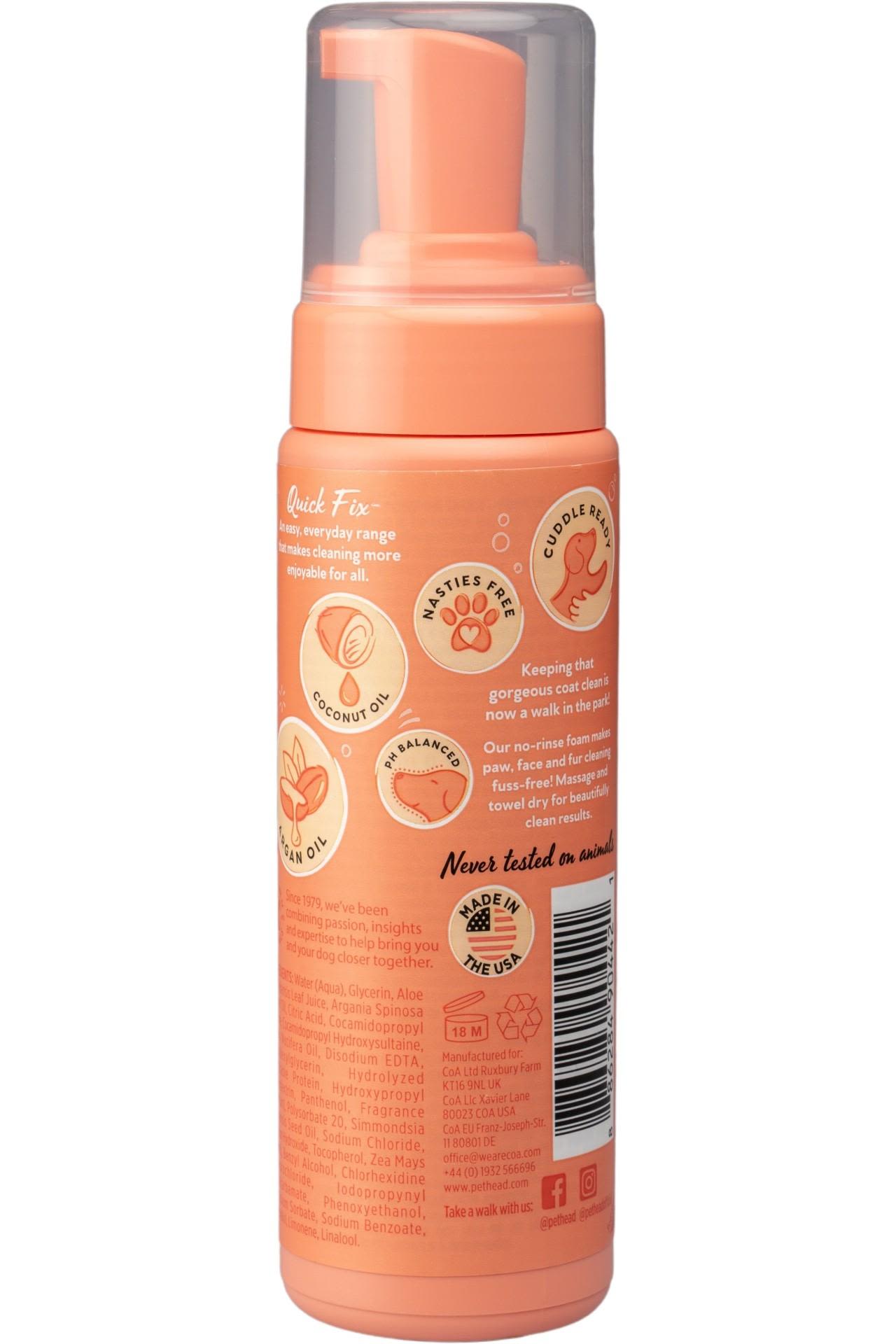 Quick Fix - No rinse Foam - Our no-rinse foam makes paw, face and fur cleaning fuss-free! With our amazing peach fragrance, which is very popular, with a fruity note, sweet, nectarous and powdery it confers a softness and gentleness to our pooches. Keeping that gorgeous coat clean is now a walk in the park! With natural oils & Extracts - Our quick fix, no-rinse foam contains 3 amazing oils - Argan, Coconut and Jojoba oil, that all work to provide softness while nourishing your pooch's skin and coat. High quality ingredients - all Pet Head products are pH balanced, contain aloe vera & vegetable protein and are packed with natural and wholesome ingredients. All our fragrances are exclusive to Pet Head and were designed and formulated with rare & upmarket ingredients leaving your pooch smelling amazingly fresh & fruity.