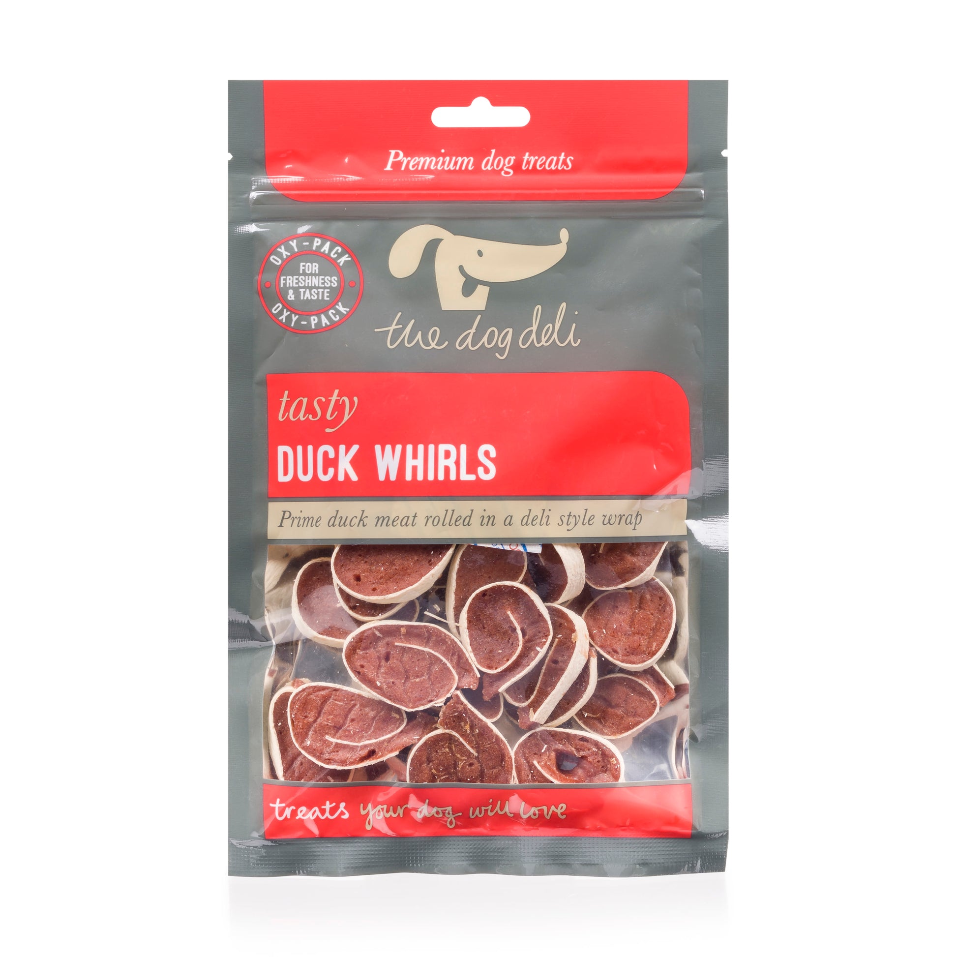 Petface The Dog Deli Duck Whirls are a great snack for your dog. This treat is great for training, play and for a tasty snack. This will be a favourite with all canine connoisseurs. Oxy-Packed for freshness in a resealable pouch, ideal for storage and the perfect size for slipping into a bag or pocket if you want tasty treats on the go.