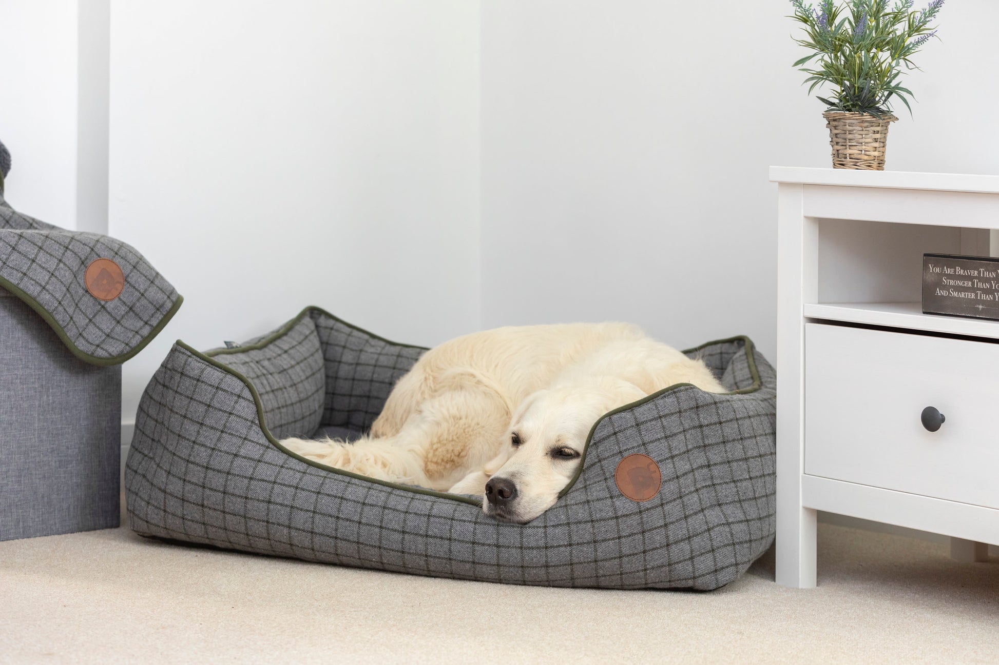 Petface Moss Green square dog bed with reversible cushion and anti slip base. It is machine washable at 30 degrees. Helping to let your pet relax and sleep comfortably by keeping them warm and giving a feeling of security.