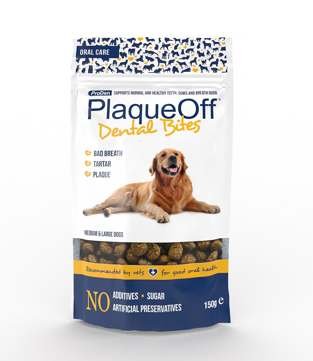 ProDen PlaqueOff® Dental Bites are an innovation for your dog's oral health. If your pet has bad breath, it may have an oral hygiene problem. PlaqueOff Dental Bites have a systemic effect that may help dental plaque from adhering to the teeth and softening tartar deposits.