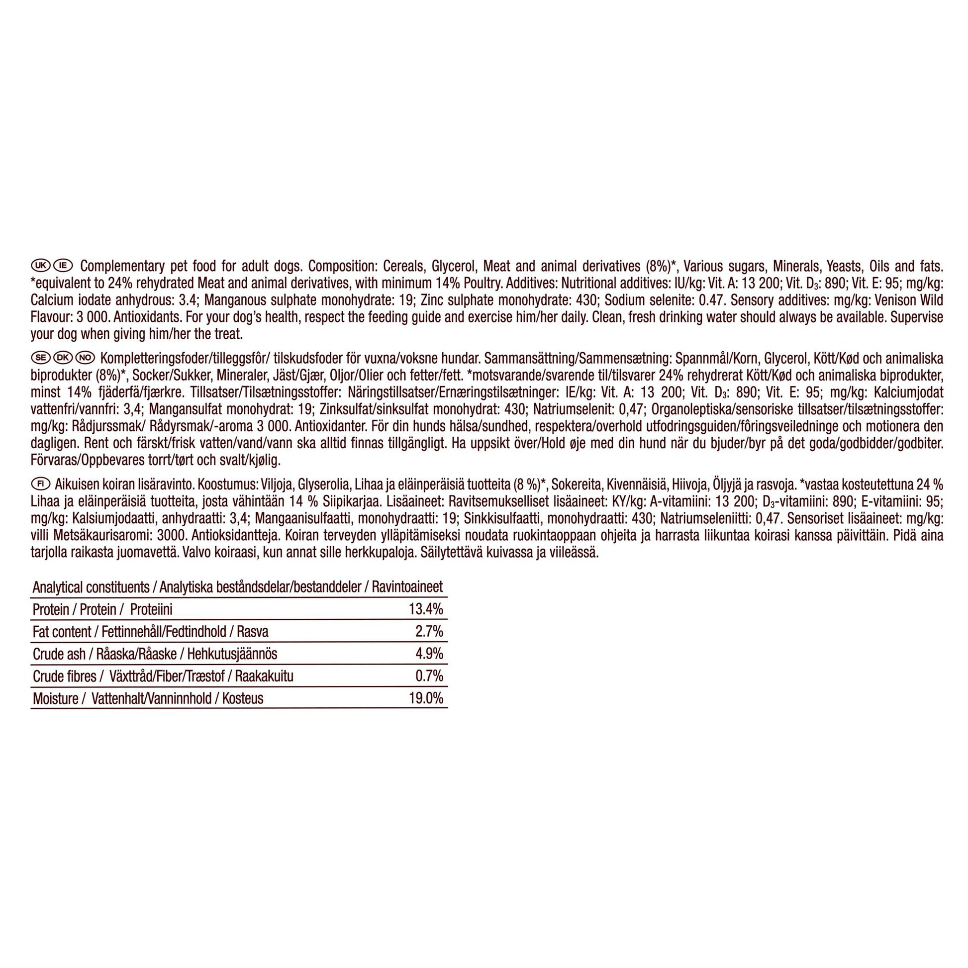 Every Adventuros Venison Wild Flavour Strip is the start of an exciting new adventure for your dog. Adventuros Strips are tasty low in fat dog treat strips, tear them into tasty pieces or feed them whole. Either way, they'll get your dog's imagination running wild and free. Purina® Adventuros® comes in a resealable bag, helping to keep them fresh.