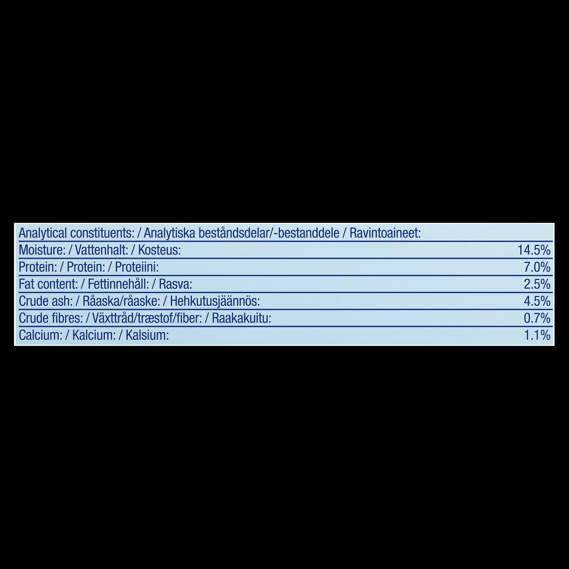 Analytical Constituents: Moisture: 14.5%, Protein: 7.0%, Fat Content: 2.5%, Crude Ash: 4.5%, Crude Fibres: 0.7%, Calcium: 1.1%.