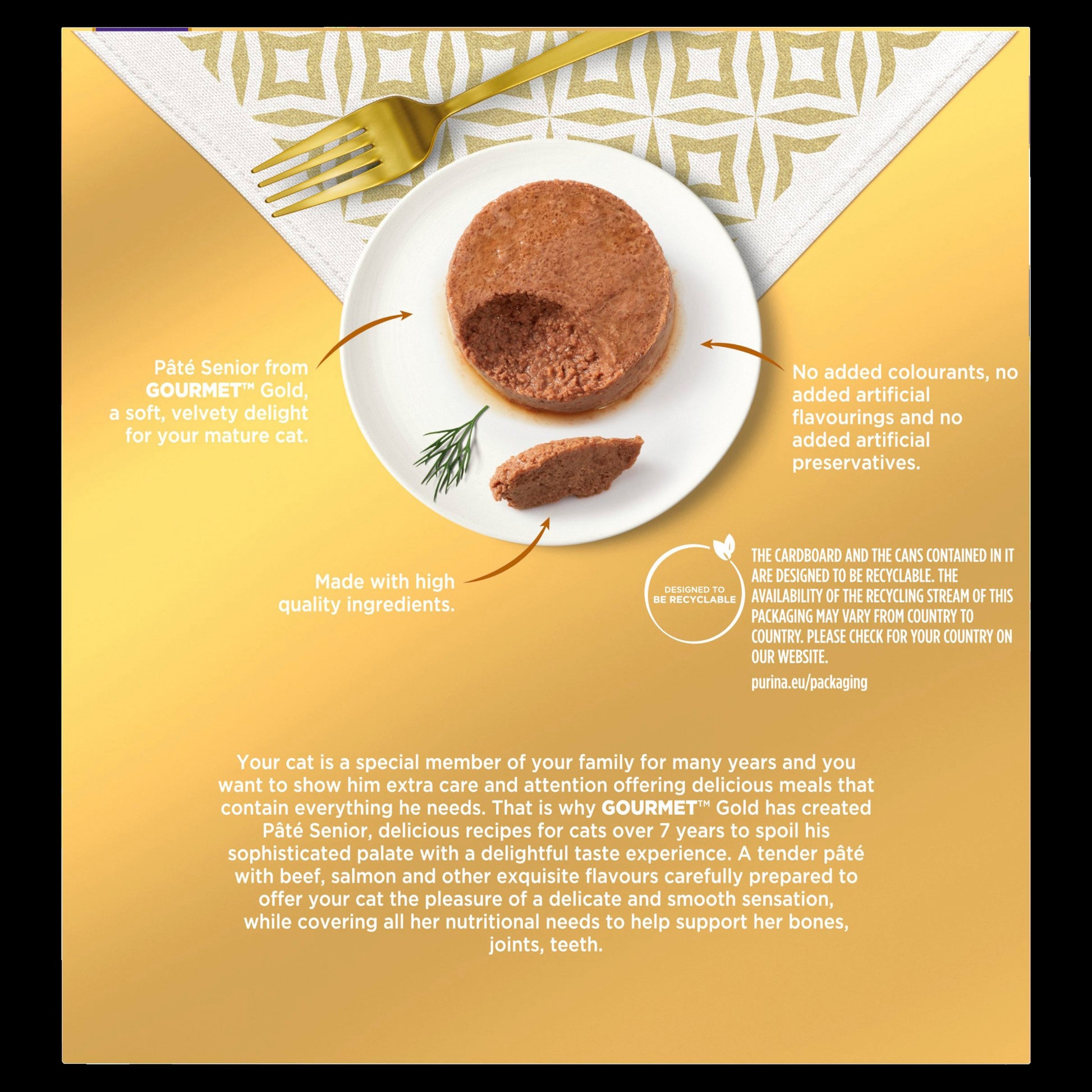 Pate Senior from GOURMET Gold, a soft, velvety delight specially elaborated for your mature cat. All GOURMET Gold recipes are made with high quality ingredients and have no added colourants, no added artificial flavourings and no added artificial preservatives.