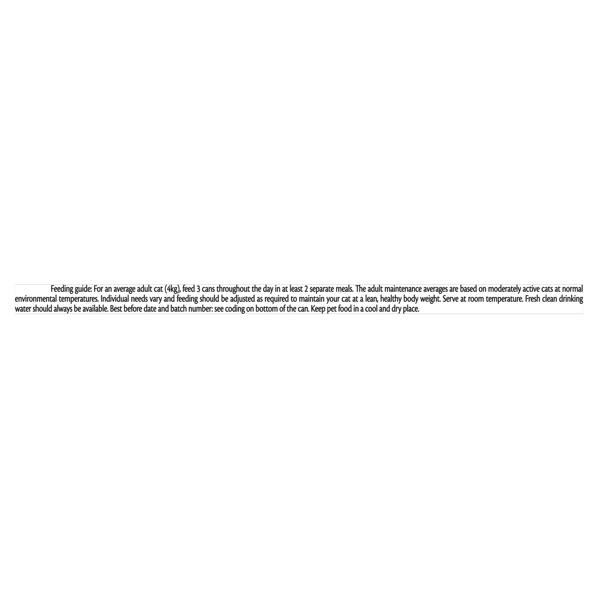 Feeding Guide: For an average adult cat (4kg), feed 3 cans throughout the day in at least 2 separate meals. The adult maintenance averages are based on moderately active cats at normal environmental temperatures. Individual needs vary and feeding should be adjusted as required to maintain your cat at a lean, healthy body weight. Serve at room temperature. Fresh clean drinking water should always be available.
