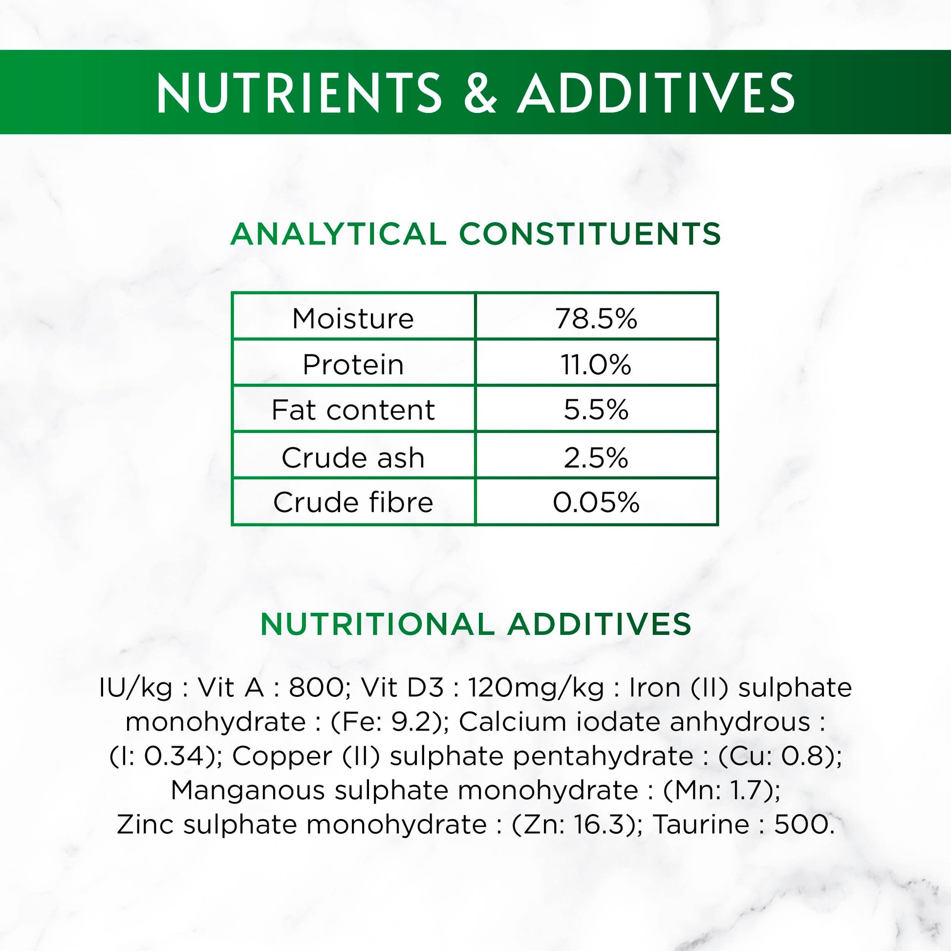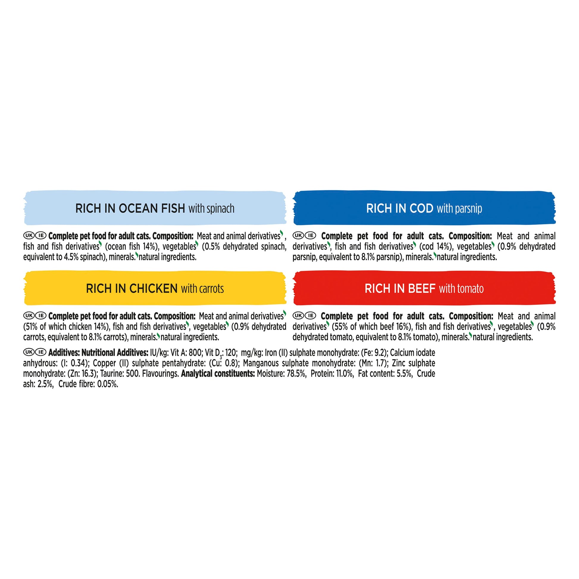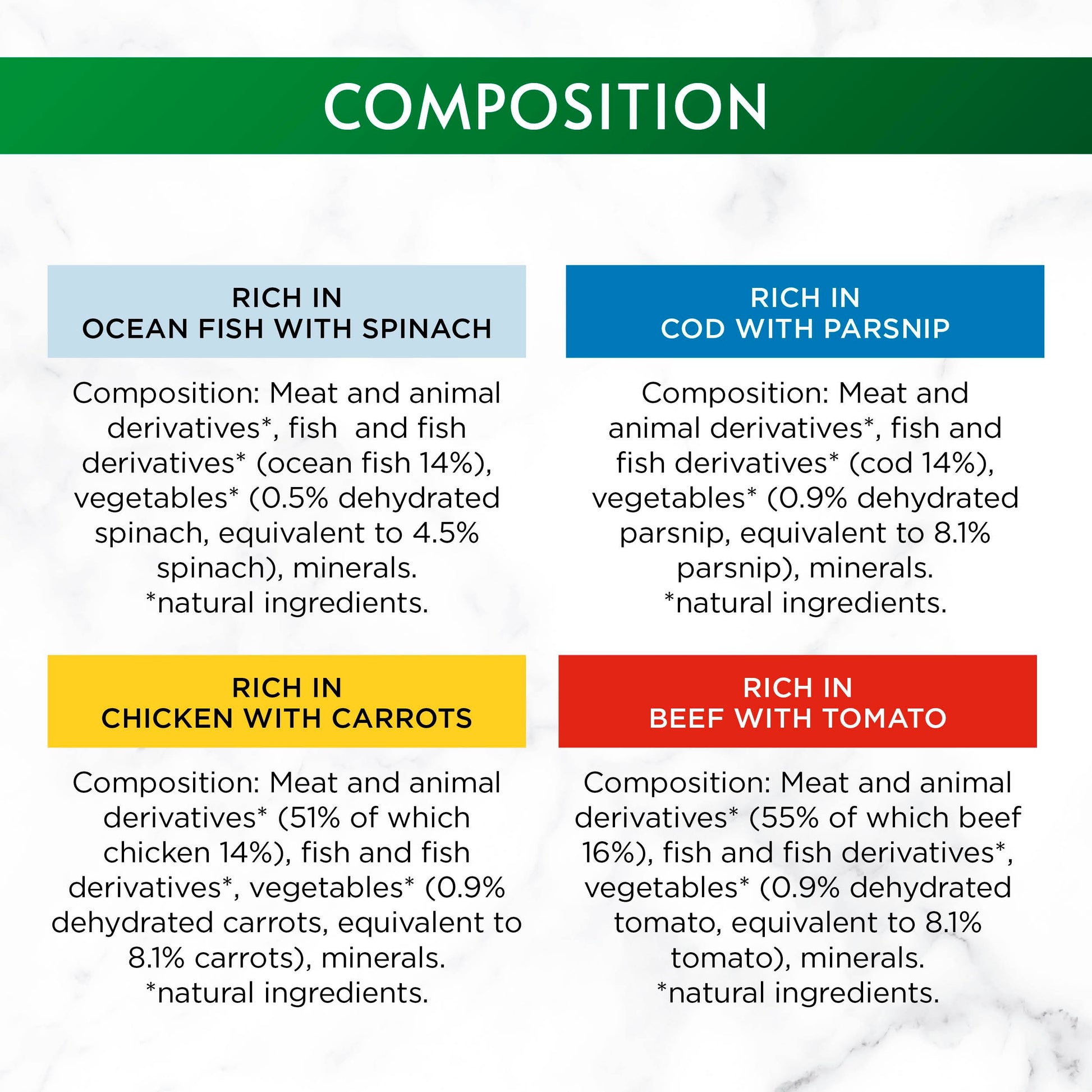 Chicken with Carrots: Meat and animal derivatives* (51% of which chicken 14%) Fish and fish derivatives*, Vegetables* (0.9% dehydrated carrots equivalent to 8.1% carrots) Minerals