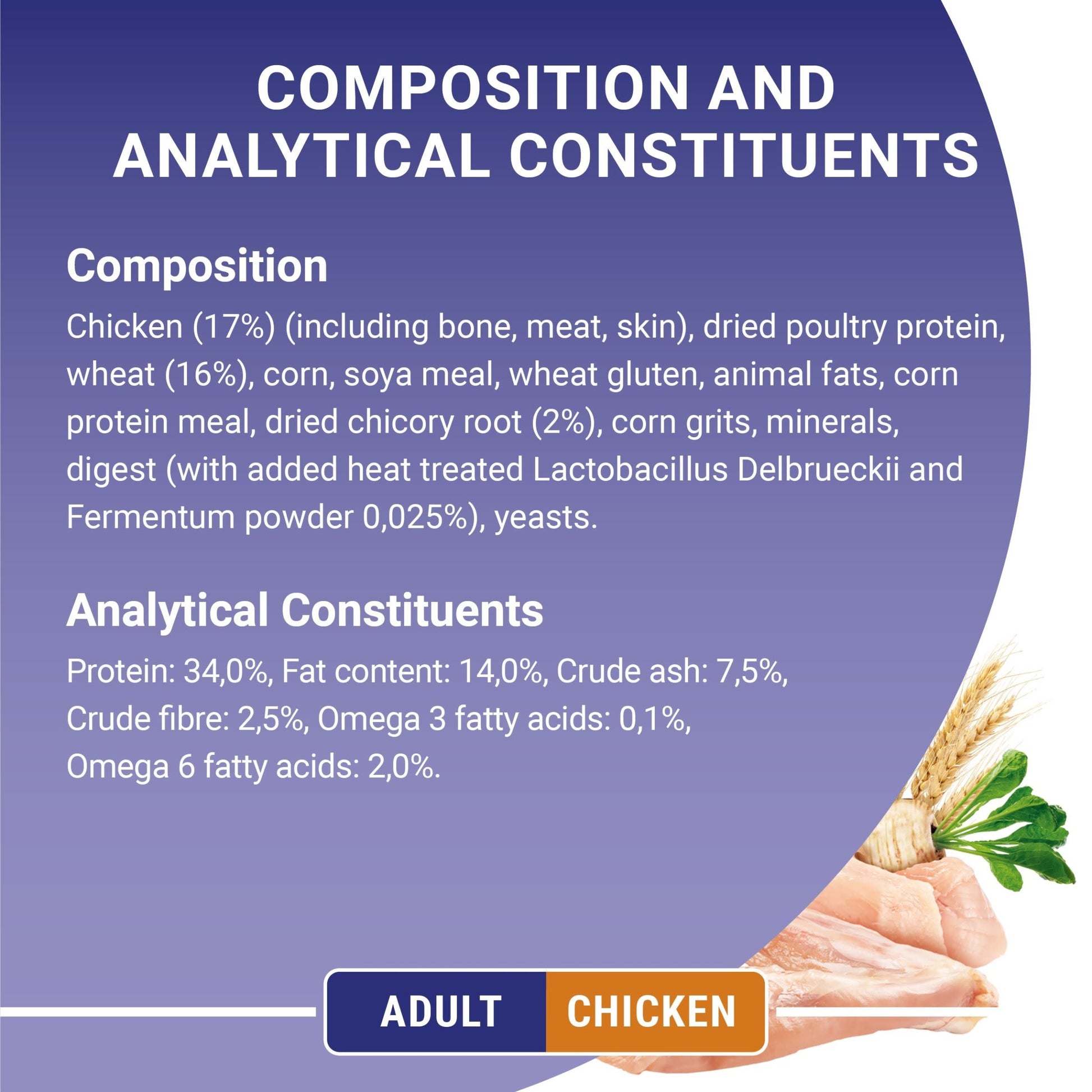 Composition: Chicken (including bone, meat, skin) (17%), Dried poultry protein, Wheat (16%), Corn, Soya meal, Wheat gluten, Animal fats, Corn protein meal, Dried chicory root (2%), Corn grits, Minerals, Digest ((with added heat treated Lactobacillus Delbrueckii and Fermentum powder 0.025%)), Dried yeast.