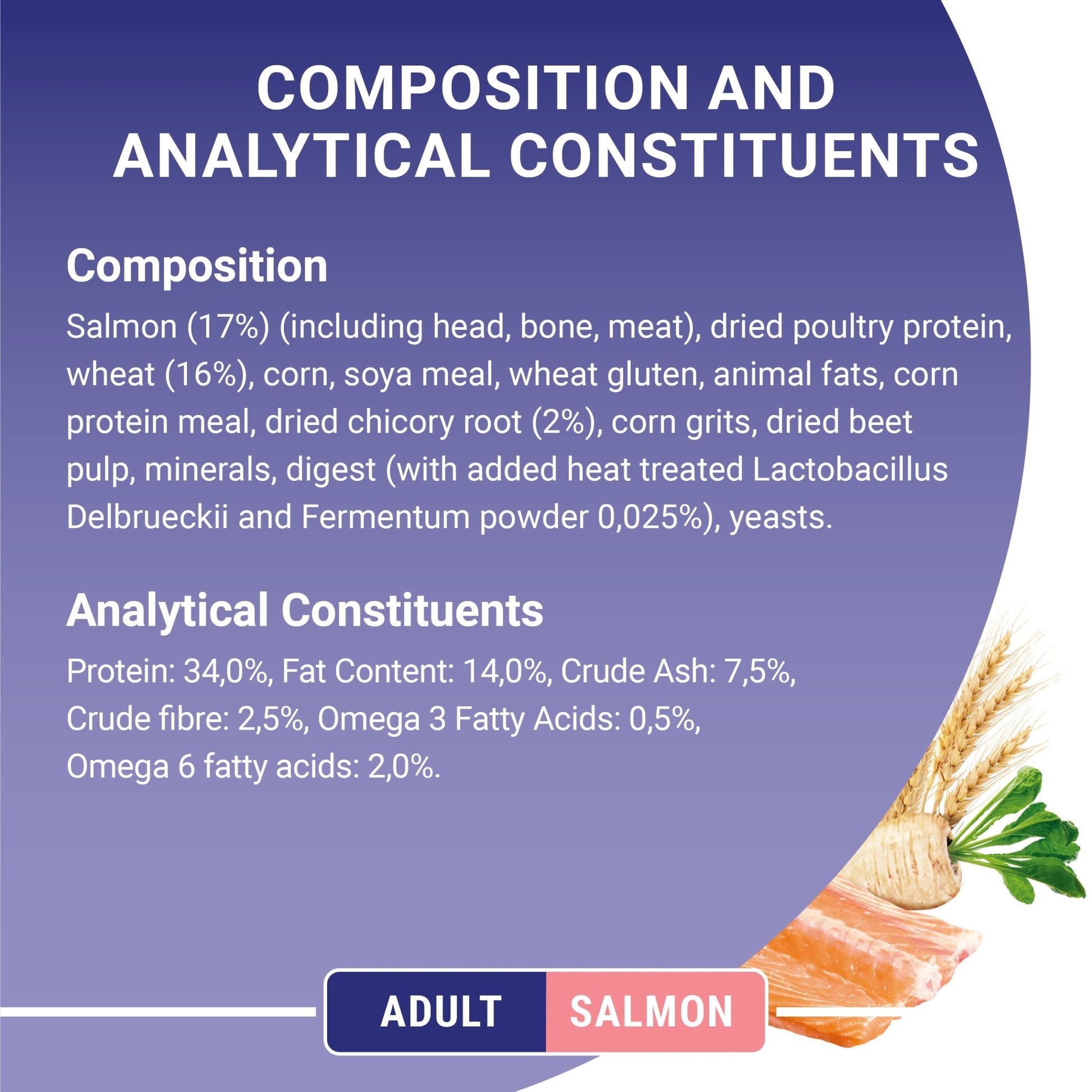 Composition: Salmon (including head, bone, meat) (17% ), Dried poultry protein, Wheat (16%), Corn, Soya meal, Wheat gluten, Animal fats, Corn protein meal, Dried chicory root (2%), Corn grits, Dried beet pulp, Minerals, Digest ((with added heat treated Lactobacillus Delbrueckii and Fermentum powder 0.025%)), Dried yeast.