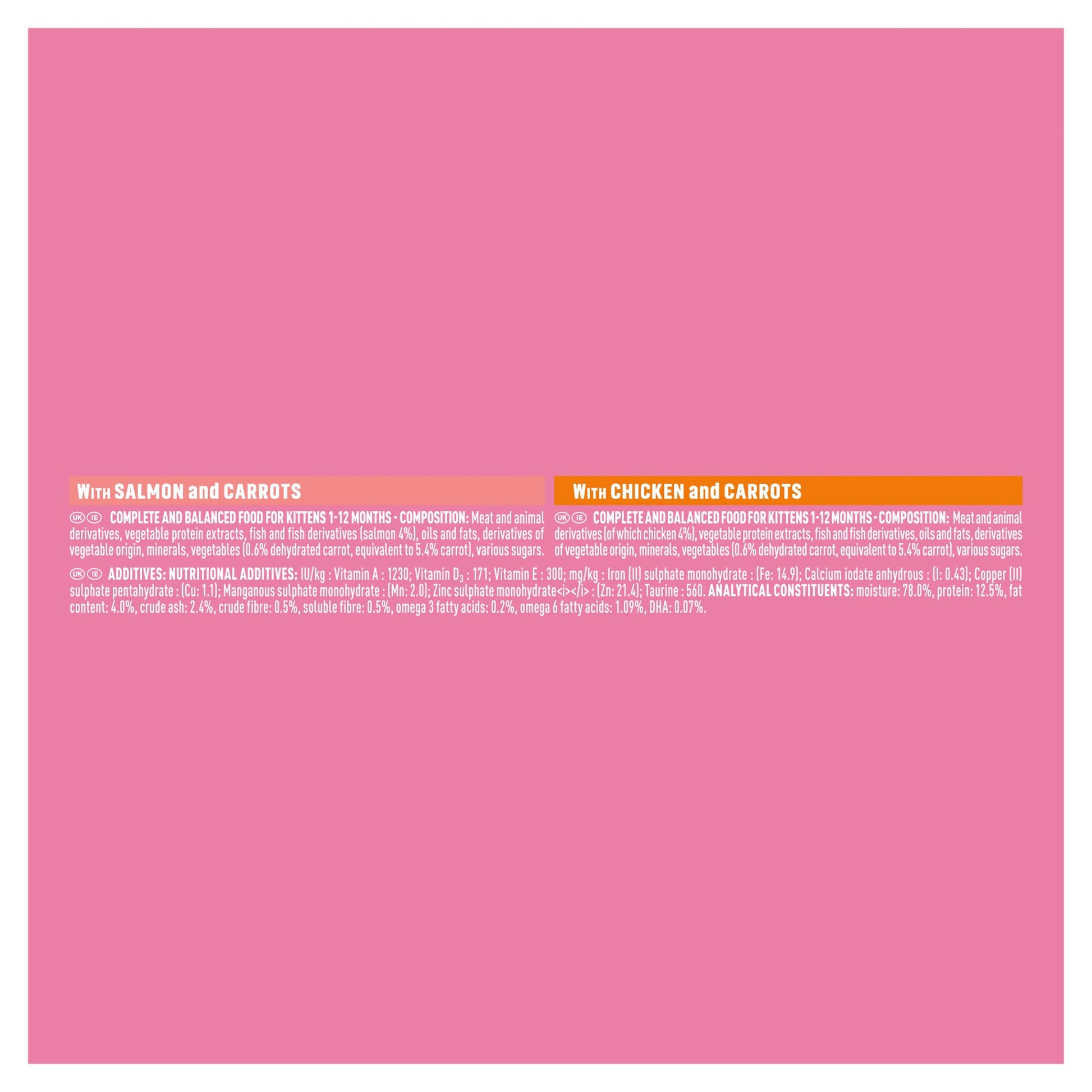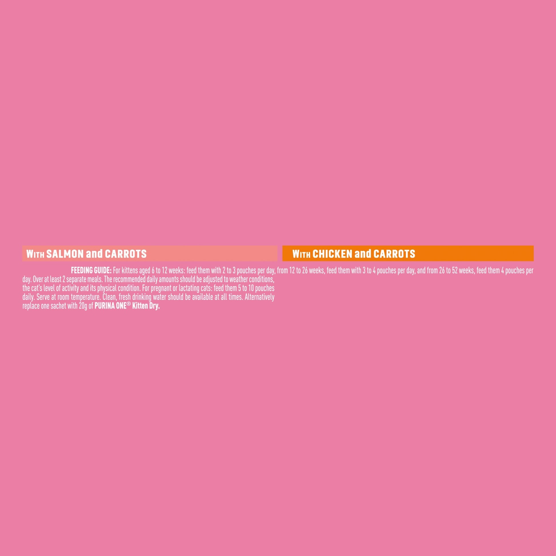 For kittens from 6 to 12 weeks, feed 2 to 3 pouches per day; from 12 to 26 weeks, feed 3 to 4 pouches per day and from 26 to 52 weeks, feed 4 pouches per day in at least 2 separate meals or at will. Each kitten is different, depending on activity level and body condition, food amounts and/or time allowed to eat may need to be adjusted.