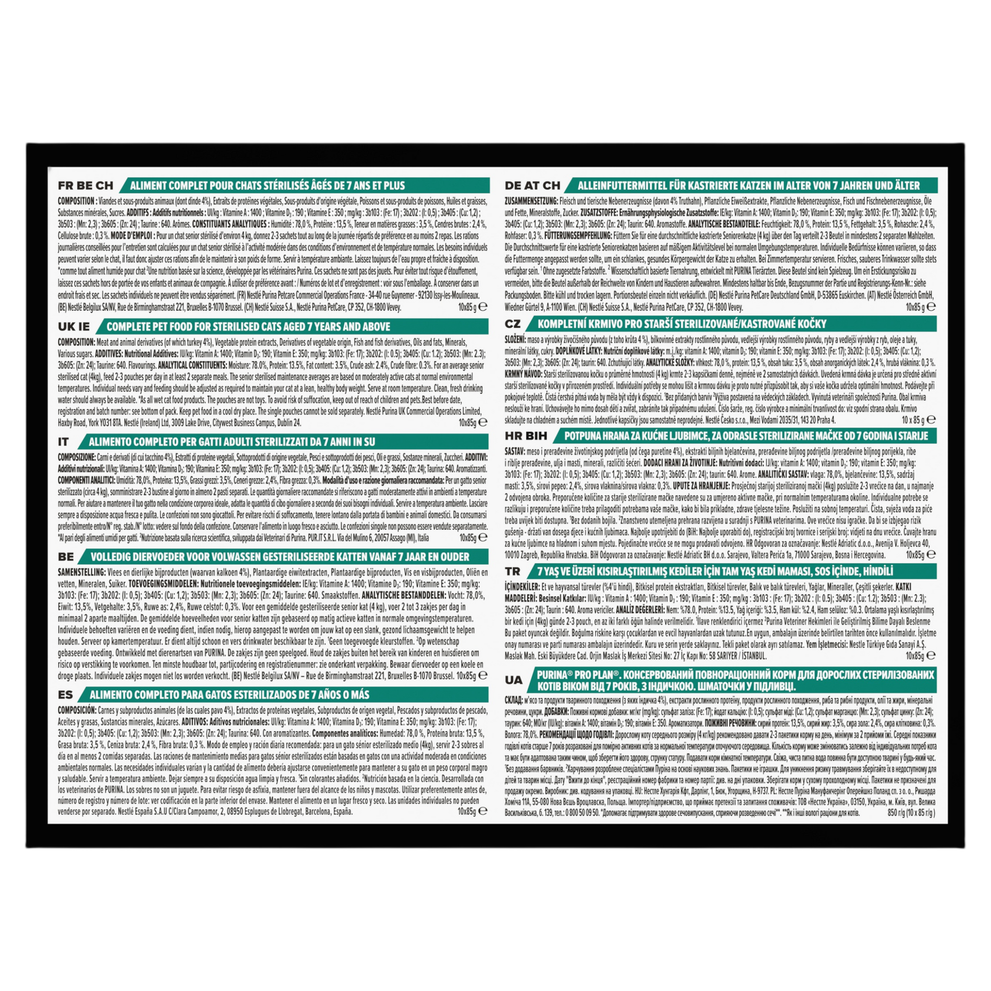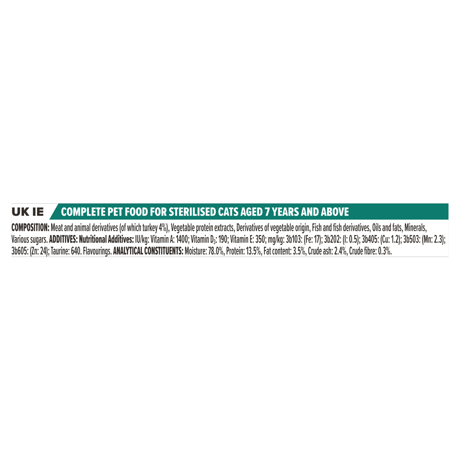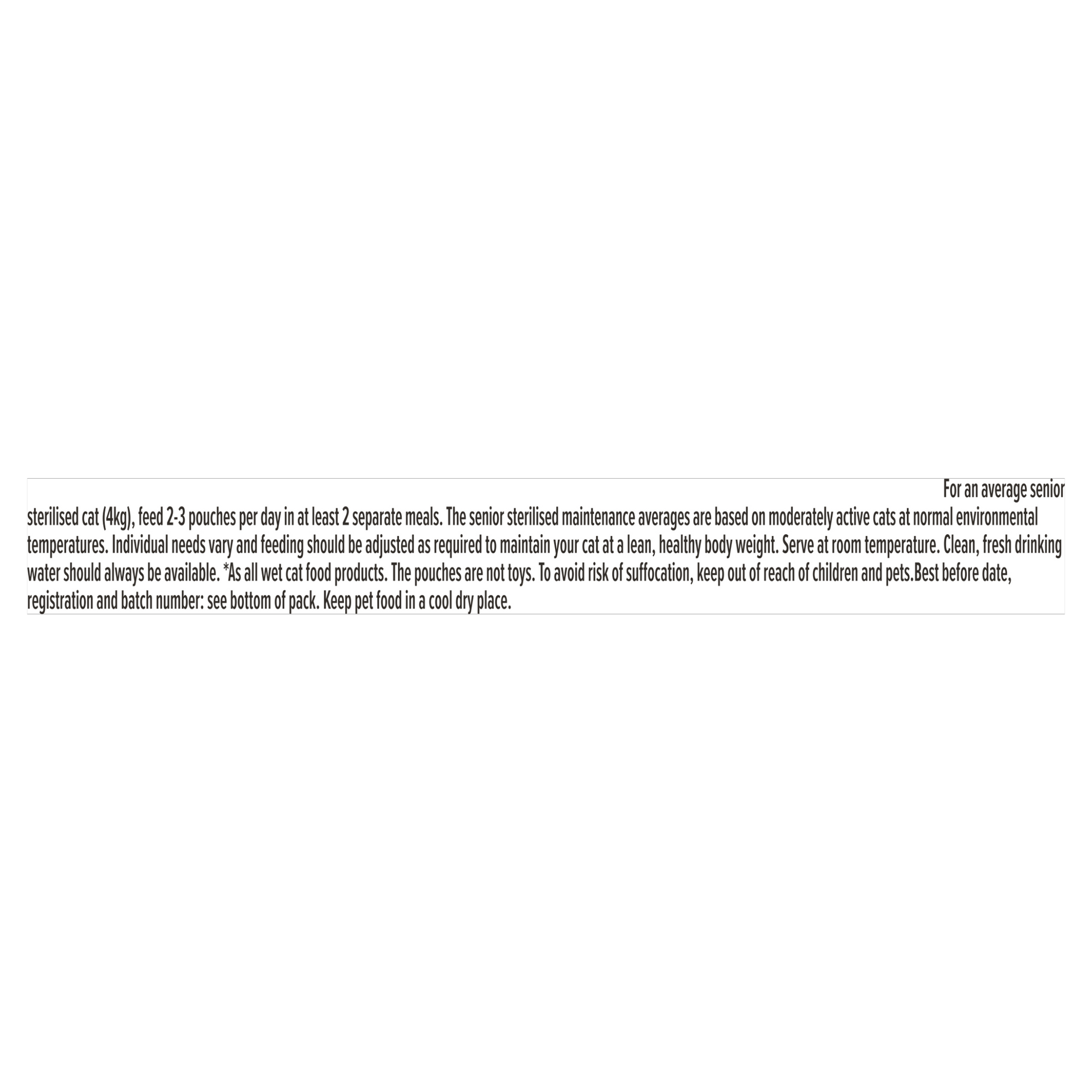 Feeding Guide: For an average senior sterilised cat (4kg), feed 2-3 pouches per day in at least 2 separate meals. The senior sterilised maintenance averages are based on moderately active cats at normal environmental temperatures. Individual needs vary and feeding should be adjusted as required to maintain your cat at a lean, healthy body weight. Serve at room temperature. Clean, fresh drinking water should always be available.