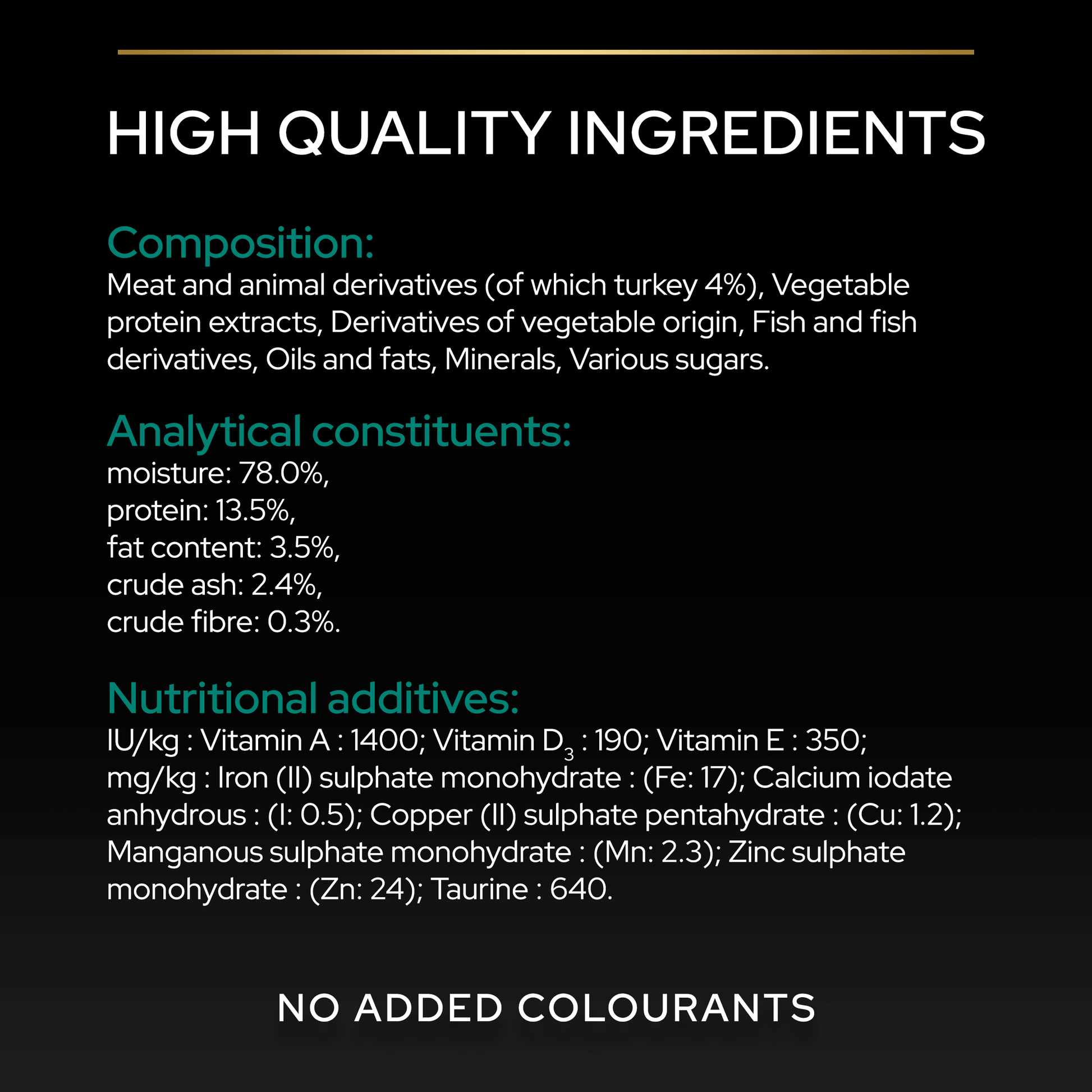Composition: Meat and animal derivatives (of which turkey 4%), Vegetable protein extracts, Derivatives of vegetable origin, Fish and fish derivatives, Oils and fats, Minerals, Various sugars.