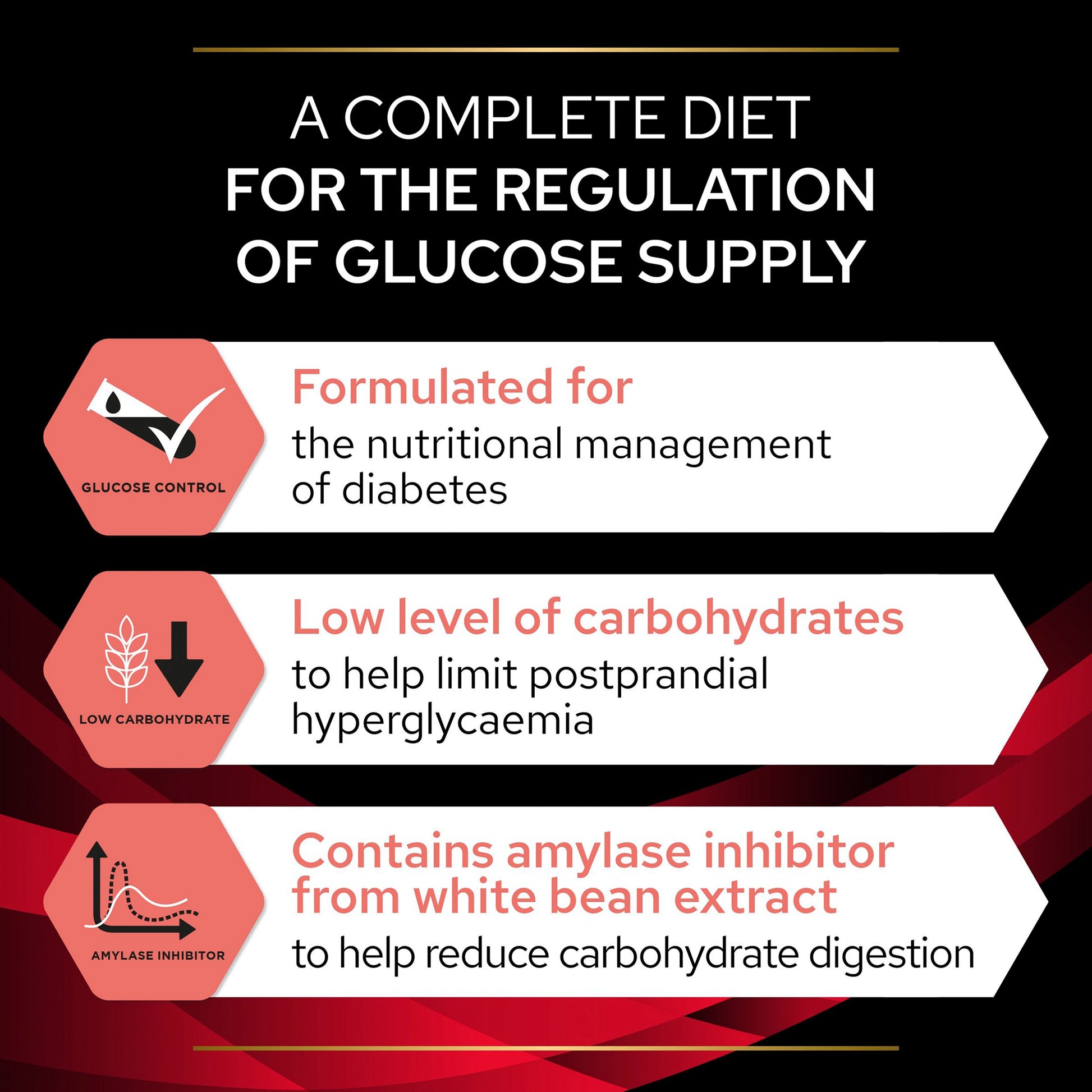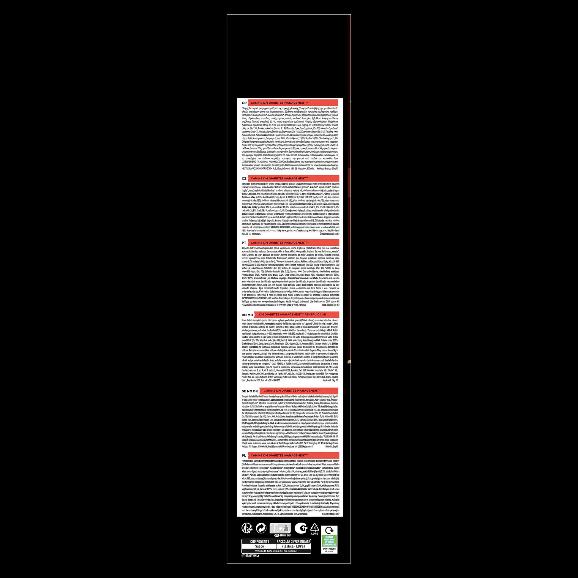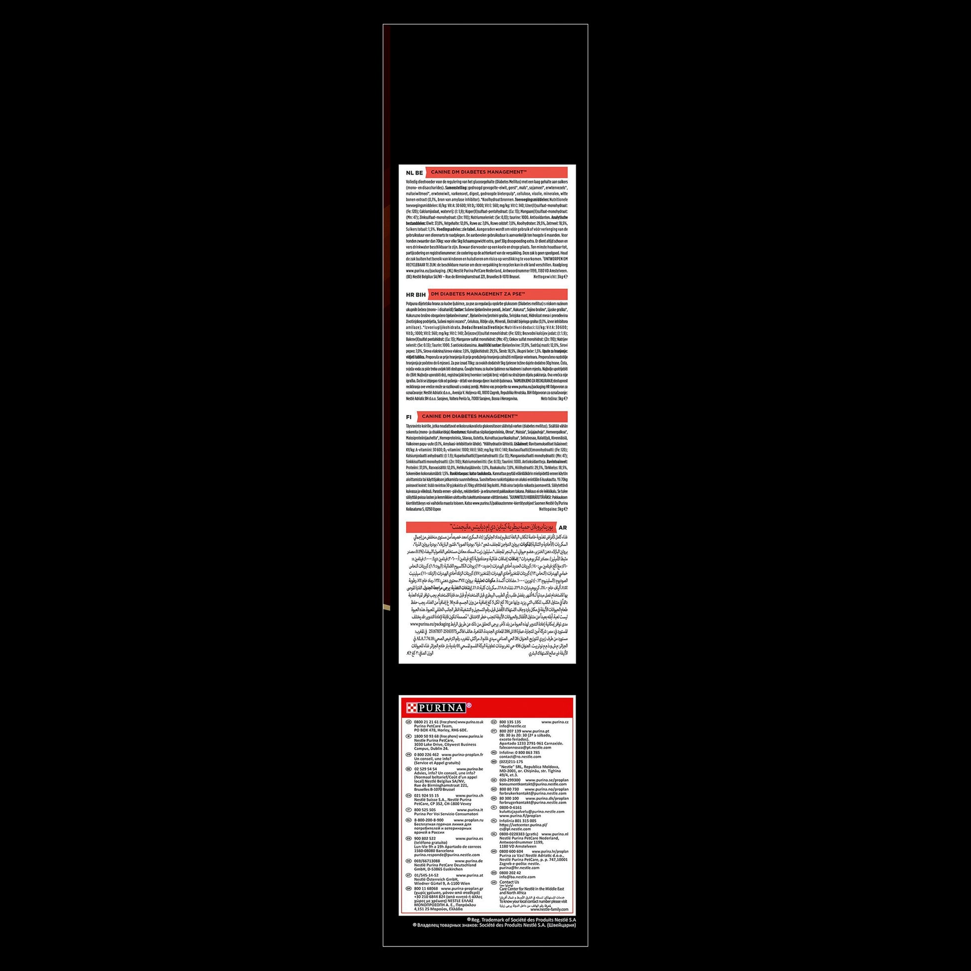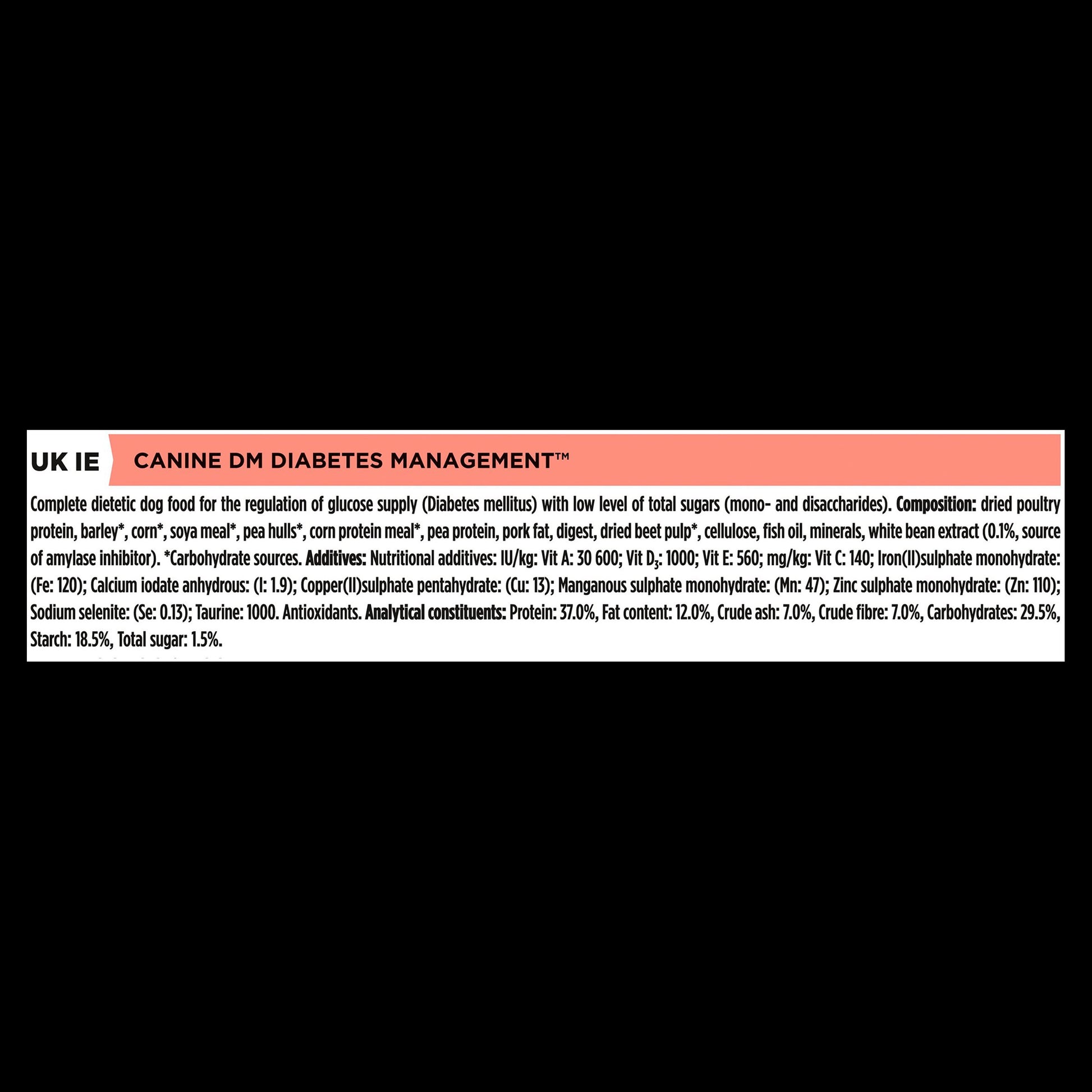 Purina Proplan Veterinary Diets Canine DM Diabetes Management is a complete veterinary diet for dogs with diabetes mellitus. PPVD DM contains fibre and low levels of carbohydrate to help slow carbohydrate absorption. It also contains extract of white bean that has been shown to control blood sugar levels after a meal. PPVD DM contains antioxidants to help reduce oxidative stress in diabetic dogs.