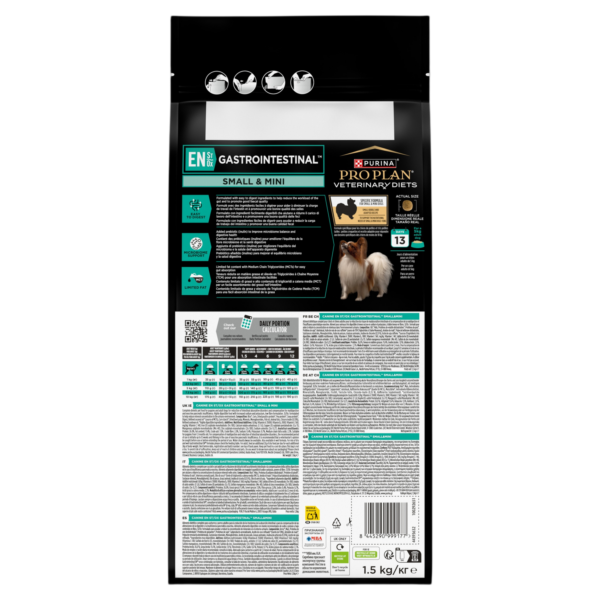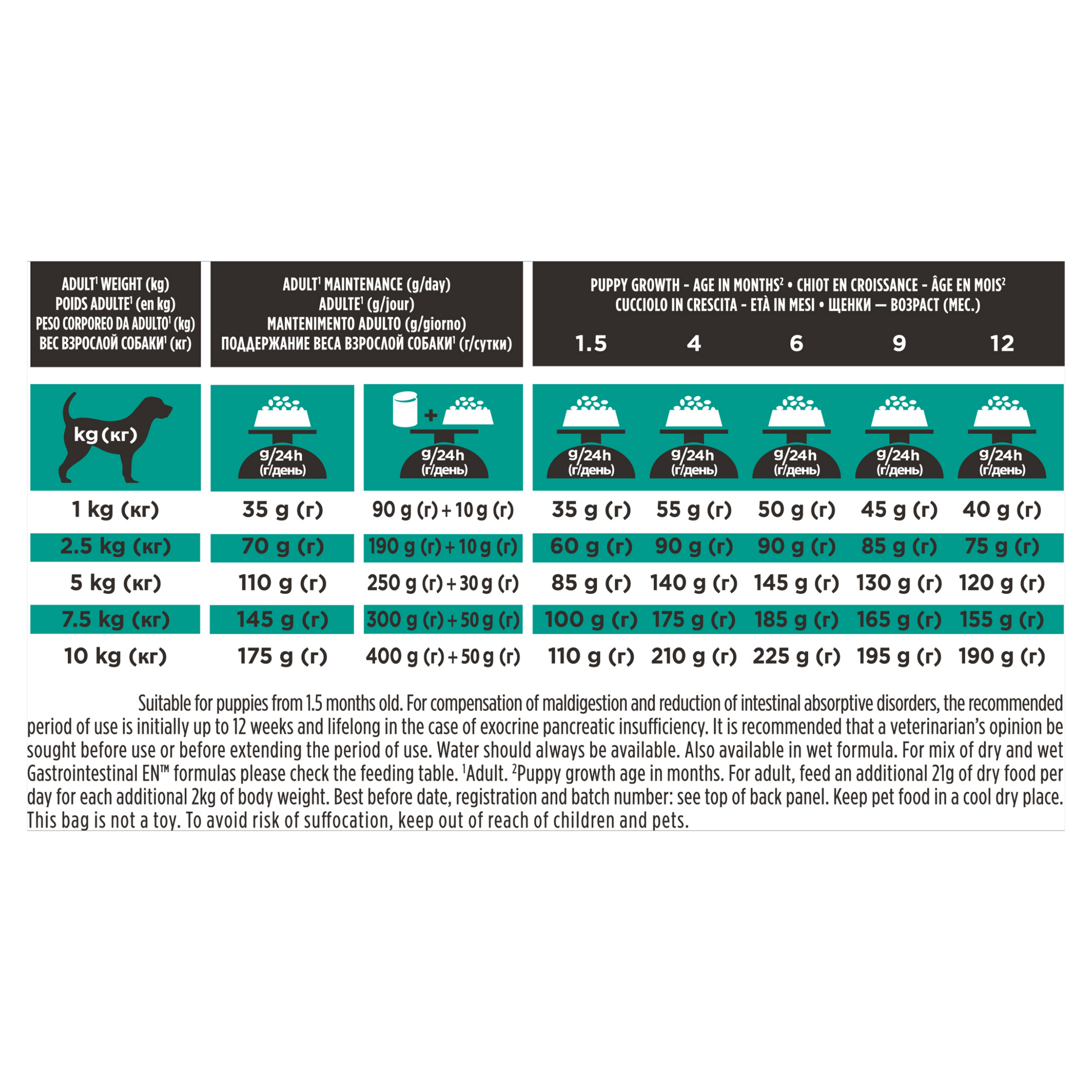 Feeding Guide: Suitable for puppies from 1.5 months old. For compensation of maldigestion and reduction of intestinal absorptive disorders, the recommended period of use is initially up to 12 weeks and lifelong in the case of exocrine pancreatic insufficiency. It is recommended that a veterinarian’s opinion be sought before use or before extending the period of use. Water should always be available. Also available in wet formula. For mix of dry and wet Gastrointestinal EN formulas please check the feeding table. (1) Adult. (2) Puppy growth age in months.