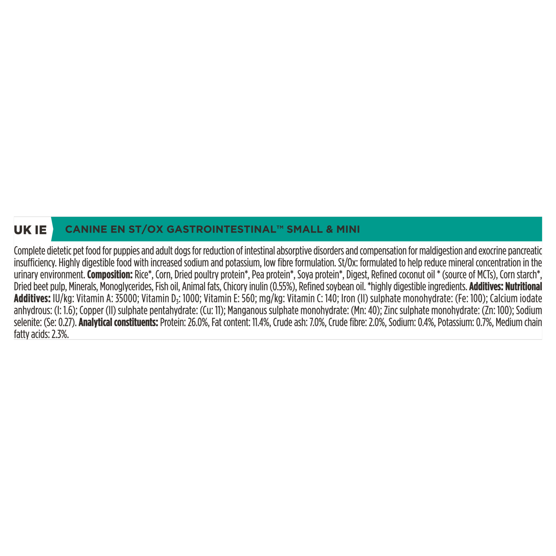 A complete dietetic dry dog food diet for the reduction of intestinal absorptive disorders, compensation for maldigestion and exocrine pancreatic insufficiency in small & mini dogs of all ages. Formulated with easy to digest ingredients to promote faecal quality and an easy to absorb fat source high in Medium Chain Triglycerides (MCTs). Added prebiotic to improve microbiome balance and digestive health. It also has a great taste. This is a dietetic product that should always be fed under veterinary supervision.