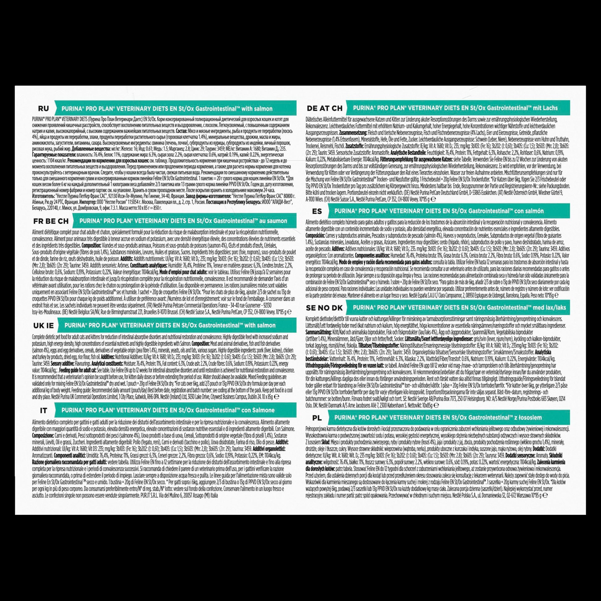 Complete dietetic pet food for adult cats and kittens for reduction of intestinal absorptive disorders and nutritional restoration and convalescence. Highly digestible feed with increased sodium and potassium, high energy density, high concentrations of essential nutrients and highly digestible ingredients with salmon.