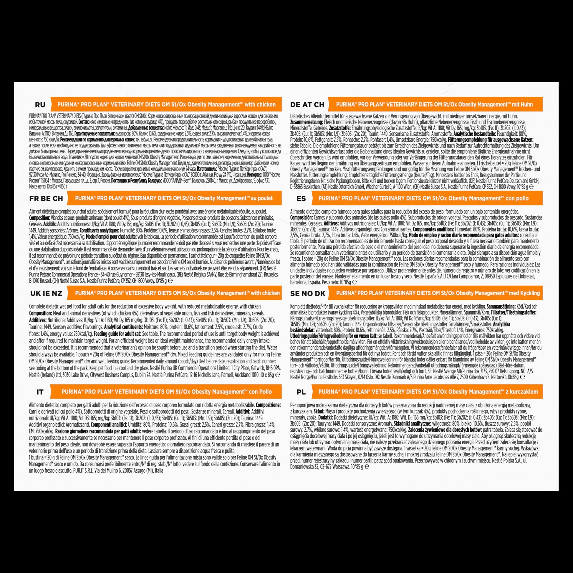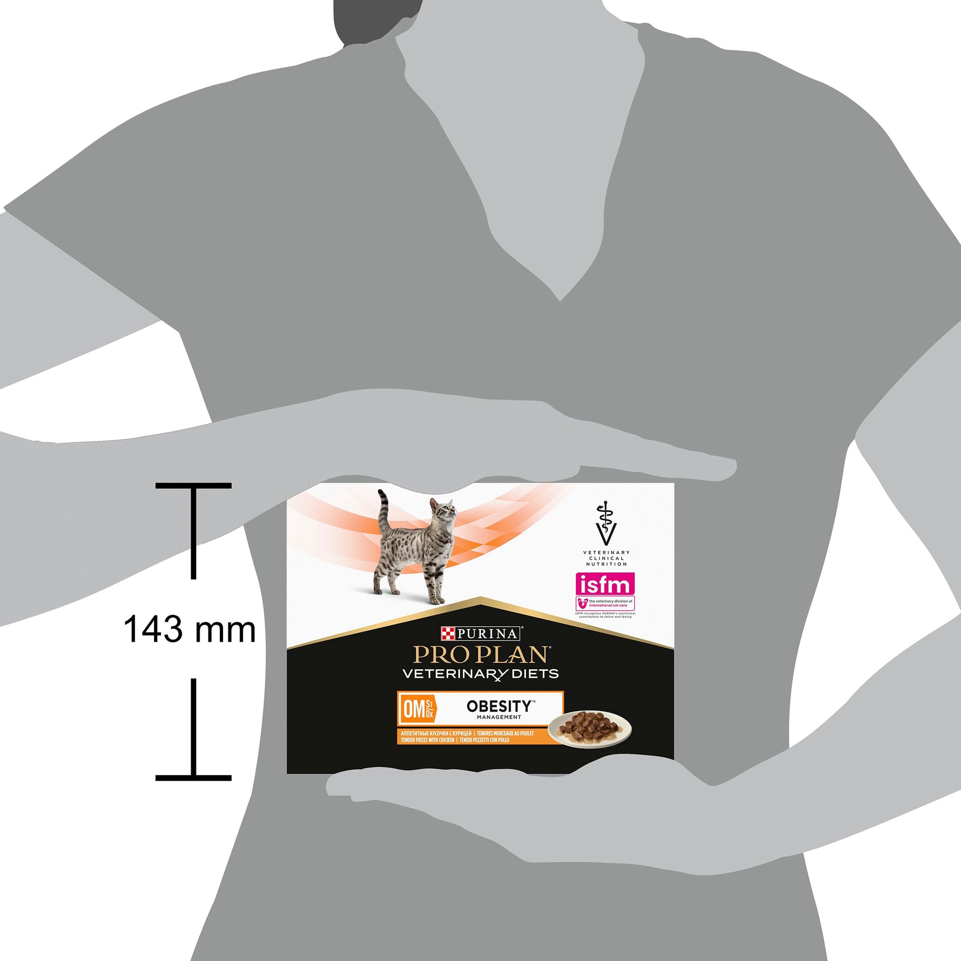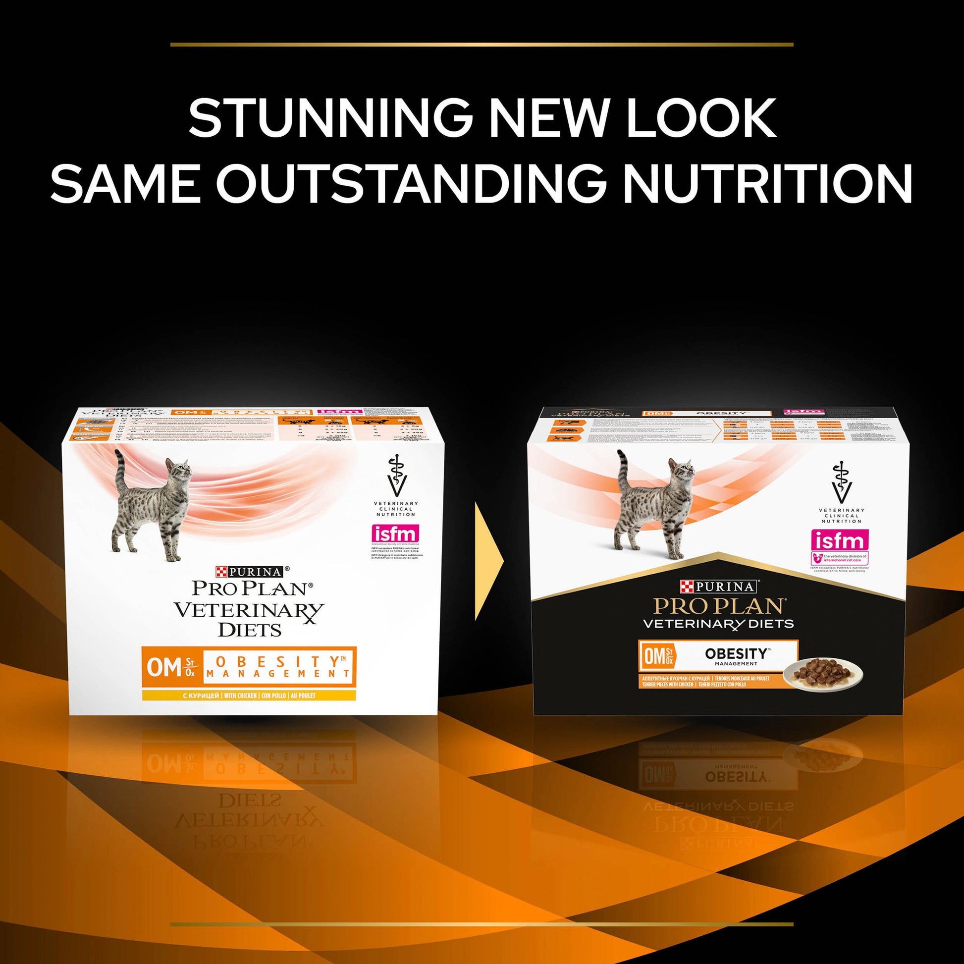 Our rescue cat came to us overweight (6.7 kilos, target 5.5) and we struggled for three years with a variety of vetinary diets which had little effect other to ensure she was hungry and begging all the time. She then started to be sick when she was hungry. Our vet then suggested Purina OM which I started without much expectation of success. I am delighted to say, however, that it is having amazing results. She has two pouches and 25 grams of biscuits divided into several little meals and is completely satisfied until her next mealtime. She absolutely loves the wet food and licks the plate. Even better, in two months she has gone from 6.6 kilos to 6.25. Obviously still some way to go but this diet is so easy for us both that I have no doubt we will get there. Highly recommended.