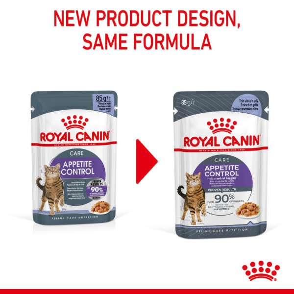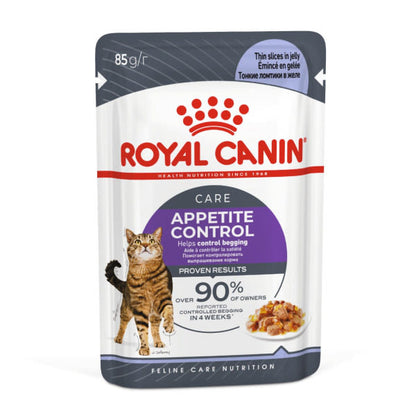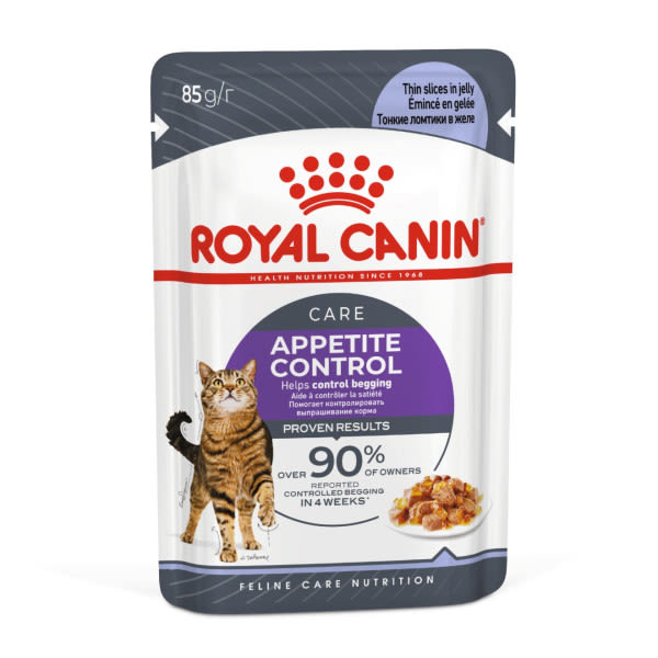 Hunger Regulation: Promotes feeling of fullness. Some cats' appetites are difficult to satisfy. Royal Canin® Appetite Control Care chunks in jelly helps reduce the feeling of hunger with a specific moisture content to help satisfy the appetite of cats that have a tendency to beg for food between meals.