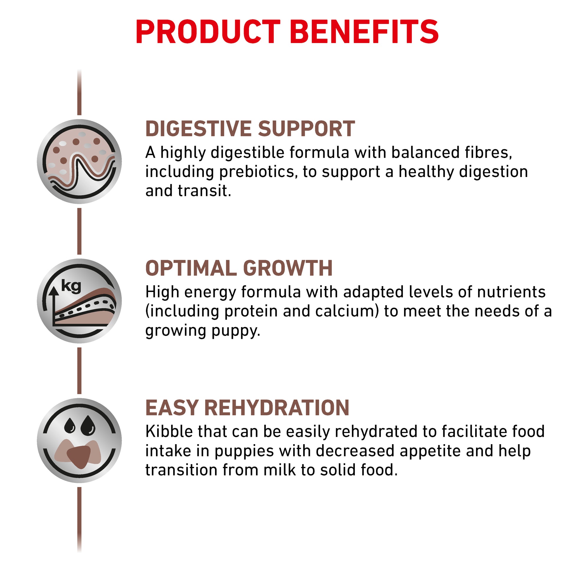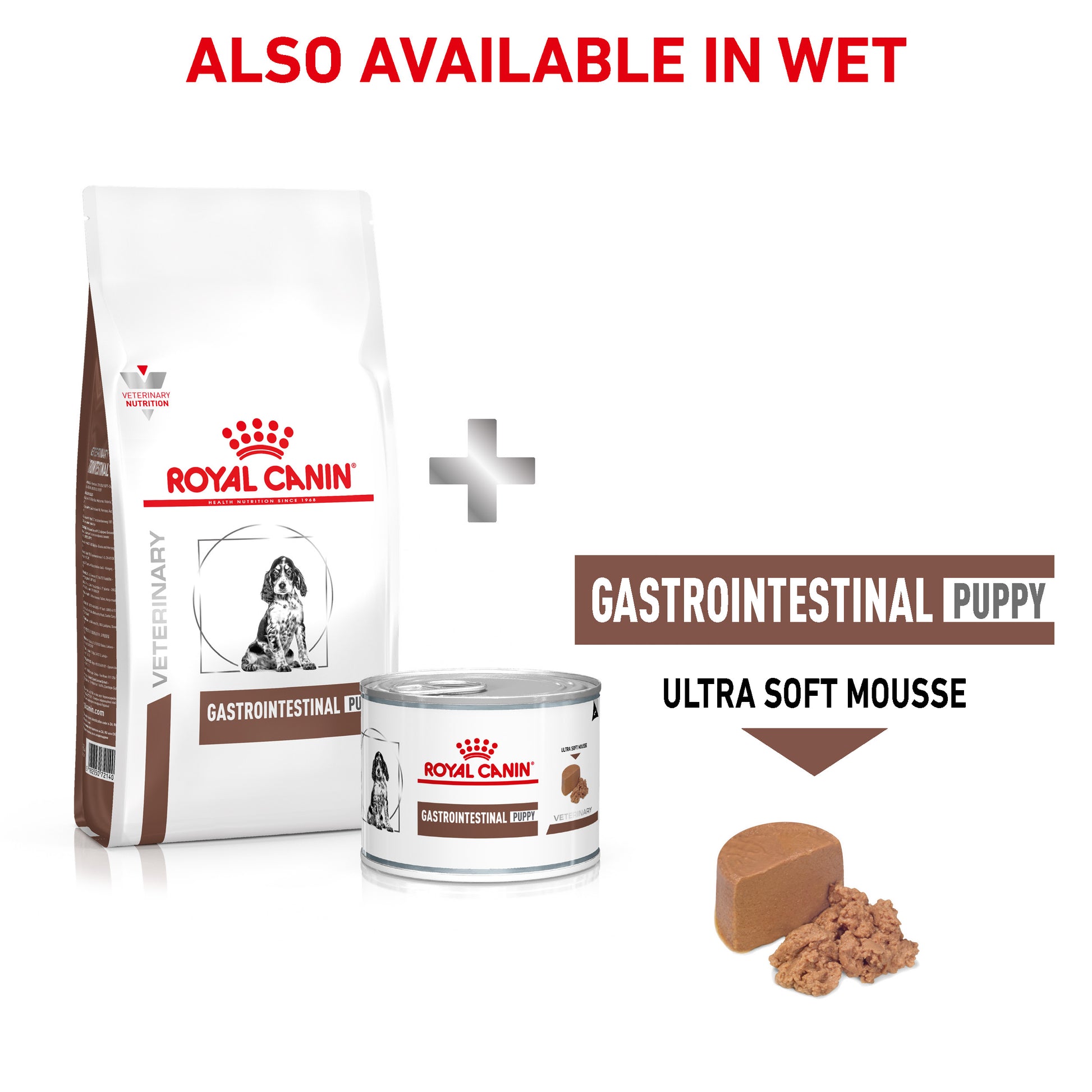 | ROYAL CANIN® Veterinary Health Nutrition Since 1968, Royal Canin has been following the belief that nutrition plays a key role in supporting the health and wellbeing of cats and dogs. This is why we have designed ROYAL CANIN® veterinary diets around proven nutritional science in partnership with pet professionals and experts, delivering nutrition for pets with specific health needs. Your puppy's digestive system hasn't fully matured yet, so they might be prone to digestive sensitivities or an upset stomach from time to time. The right diet can help to support your young puppy's digestive health and give them the best possible start in life. ROYAL CANIN® Gastrointestinal Puppy food is a specially formulated gastrointestinal food for puppies to support the nutritional needs of puppies with digestive sensitivities. ROYAL CANIN® Gastrointestinal Puppy dry food is suitable for puppies with: - Acute and chronic diarrhoea (including weaning diarrhoea) - Gastritis - Maldigestion/Malabsorption - Dysorexia, re-feeding after surgery - Inflammatory Bowel Disease (IBD) - Colitis - Exocrine Pancreatic Insufficiency (EPI) - Acute hepatopathy Key Benefits: - Digestive Support o This highly digestible formula is enriched with a balance of fibres and prebiotics to help support healthy digestion and transit. - Optimal Growth o During the key growth stages, your kitten can benefit from a tailored diet that supports healthy development and optimal growth. ROYAL CANIN® Gastrointestinal Puppy boasts a high energy content, with adapted levels of calcium and protein to meet the specific nutritional needs of growing kittens. - Microbiome Support o Prebiotics help to stimulate the growth and balance of beneficial bacteria in your cat's digestive tract, contributing to a healthy digestive environment. As part of the ROYAL CANIN® Veterinary Health Nutrition range, it is important that this product is only given to your pet when recommended by a veterinary professional. Transitioning your pet from one diet to another should be a smooth and gradual process over a 7–10 day period. Please ensure you follow the correct rationing amount, especially when mixed feeding. To cater to each dog's individual preferences, ROYAL CANIN® Gastrointestinal Puppy is also available as wet food in an ultra-soft mousse. Please note: ROYAL CANIN® Gastrointestinal Puppy is not suitable for pancreatitis or history of pancreatitis, hyperlipidaemia, lymphangiectasia, exudative enteropathy. |