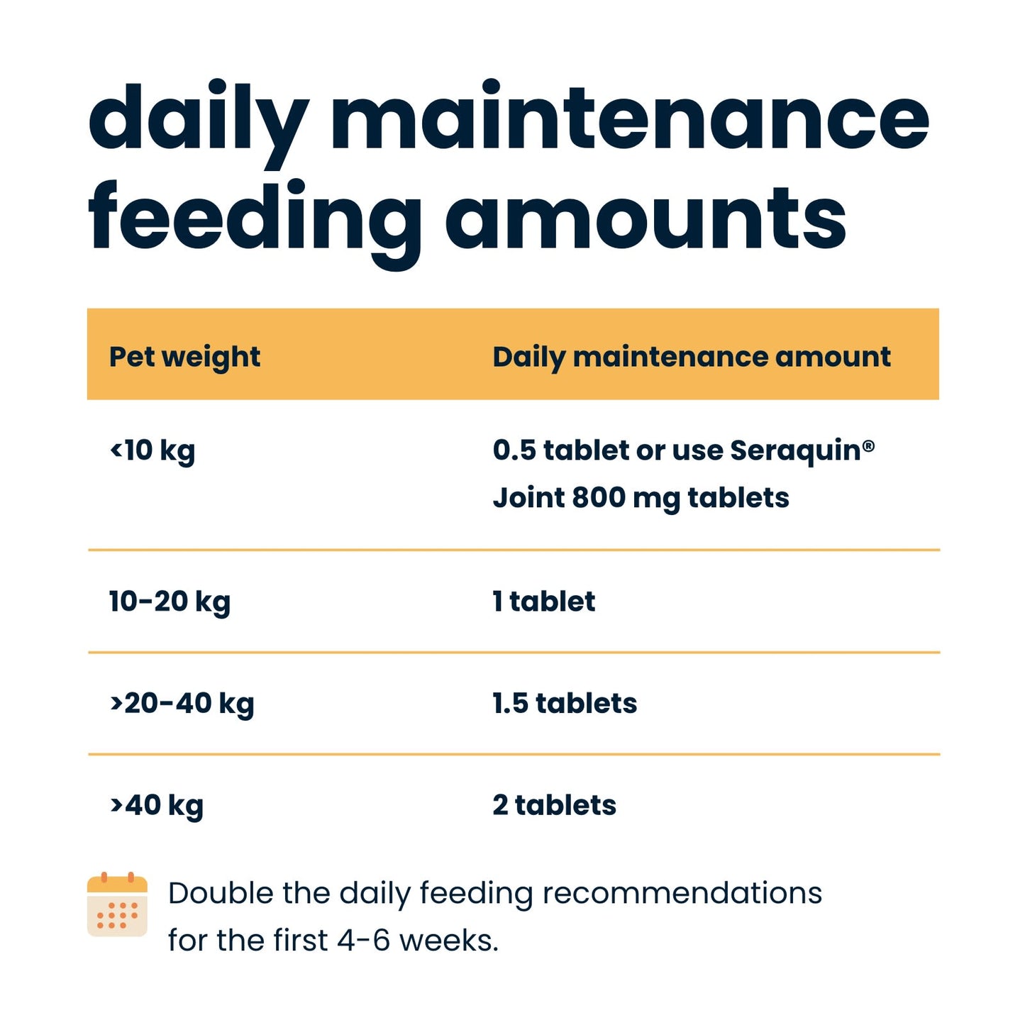 <10 Kg 0.5 tablet daily, or use Seraquin Joint 800 mg Tablets