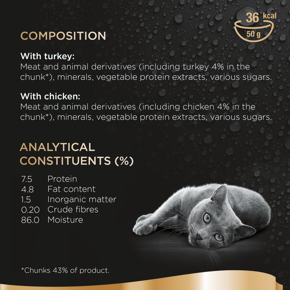 Composition: Meat and animal derivatives (45%, including 4% turkey), derivatives of vegetable origin, minerals, various sugars.