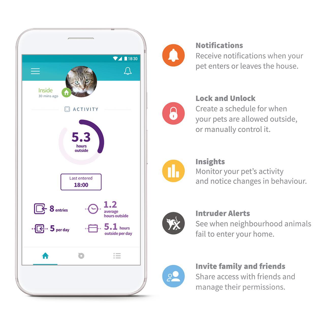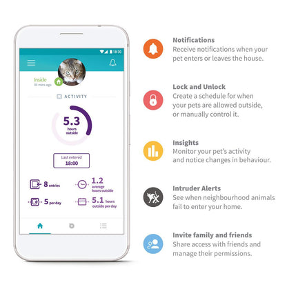 - Stay up to date and receive a notification when your cat goes in or out via the cat flap