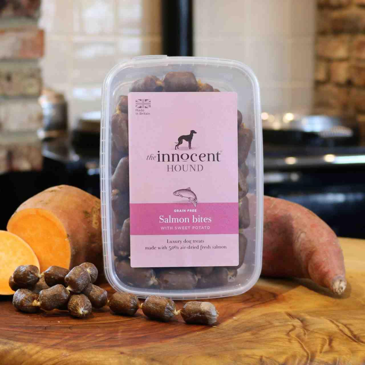 Our succulent Salmon Bites with Sweet Potato are hand-made by us in Yorkshire using sustainably sourced fresh salmon. Made with the finest ingredients, we gently air-dry our treats to retain their nutrients and flavour. A real treat for your innocent hound.