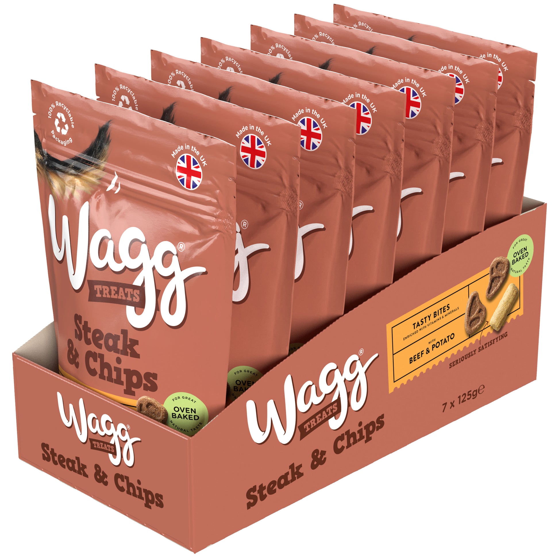 A complementary pet food for all dogs 8 weeks and over. Wagg Steak & Chips is a delicious treat for your dog, enriched with extra vitamins and minerals.