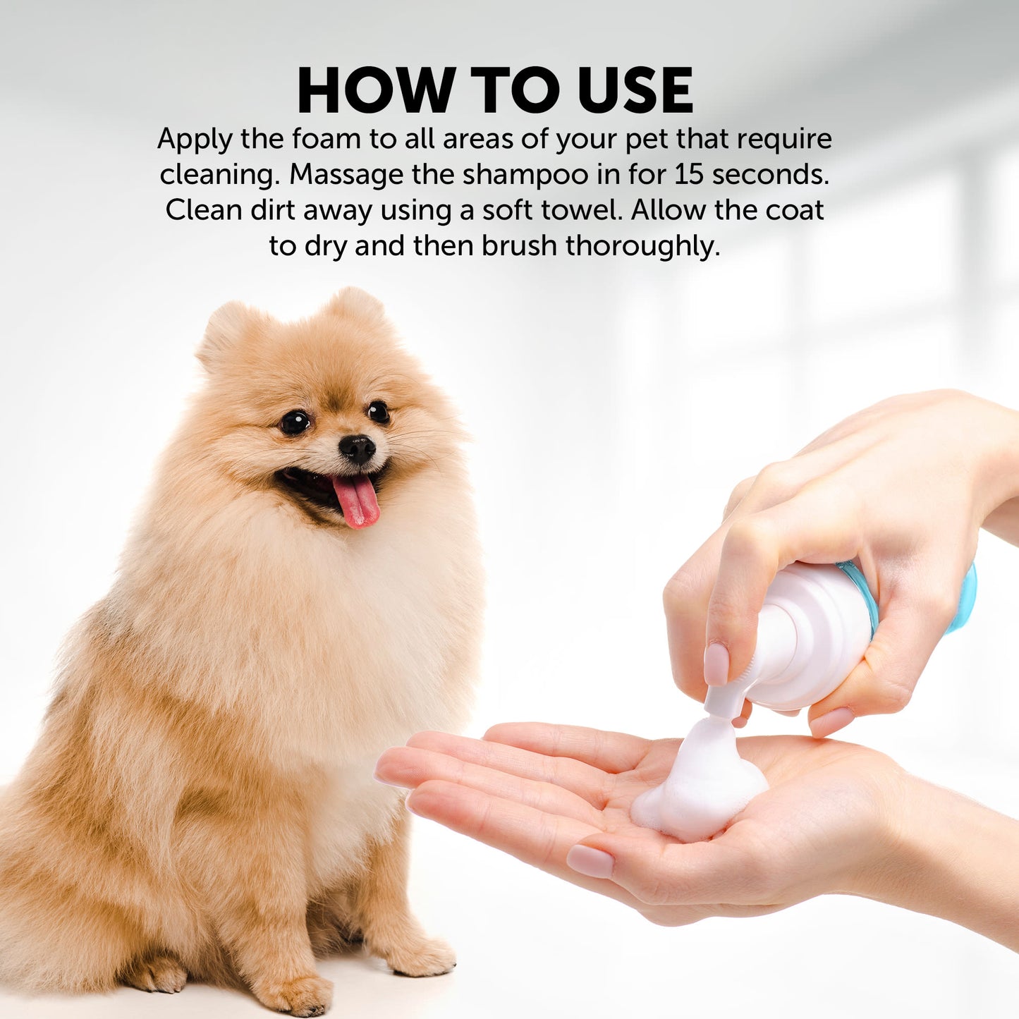 Refresh the coat in a fraction of the time required for conventional bathing, simply massage the foam into the coat and rub off with a towel. Formula contains gentle but effective cleansers derived from coconut oil. Perfect for all over cleaning or just removing dirty patches. Suitable for all pets for an easy clean, condition and deodorise - without the need for water.