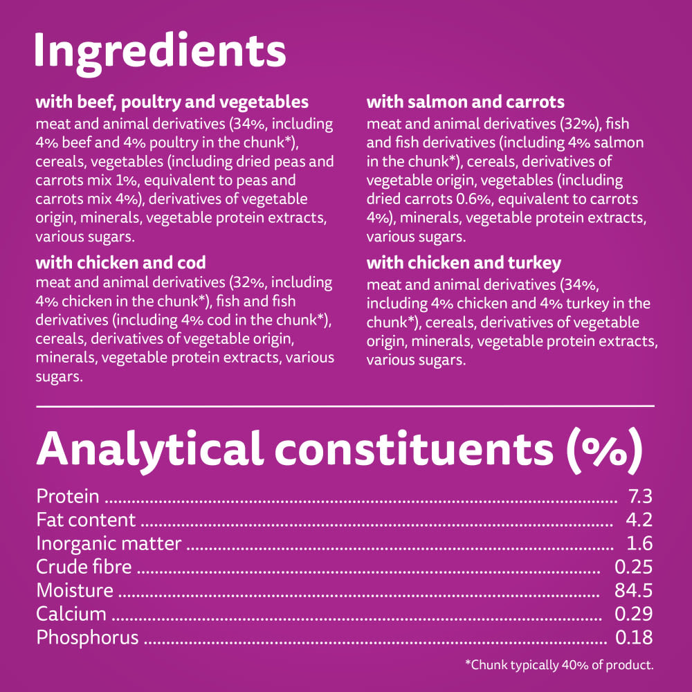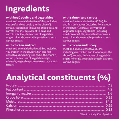 With Beef, Poultry and Vegetables Meat and Animal Derivatives (34%, including 4% Beef and 4% Poultry in the Chunk*), Cereals, Vegetables (including Dried Peas and Carrots Mix 1%, equivalent to Peas and Carrots Mix 4%), Derivatives of Vegetable Origin, Minerals, Vegetable Protein Extracts, Various Sugars, *Chunk typically 40% of Product With Salmon and Carrots Meat and Animal Derivatives (32%), Fish and Fish Derivatives (including 4% Salmon in the Chunk*), Cereals, Derivatives of Vegetable Origin, Vegetables (including Dried Carrots 0.6%, equivalent to Carrots 4%), Minerals, Vegetable Protein Extracts, Various Sugars, *Chunk typically 40% of Product With Chicken and Turkey Meat and Animal Derivatives (34%, including 4% Chicken and 4% Turkey in the Chunk*), Cereals, Derivatives of Vegetable Origin, Minerals , Vegetable Protein Extracts, Various Sugars, *Chunk typically 40% of product With Chicken and Cod Meat and Animal Derivatives (32%, including 4% Chicken in the Chunk*), Fish and Fish Derivatives (including 4% Cod in the Chunk*), Cereals, Derivatives of Vegetable Origin, Minerals, Vegetable Protein Extracts, Various Sugars, *Chunk typically 40% of product