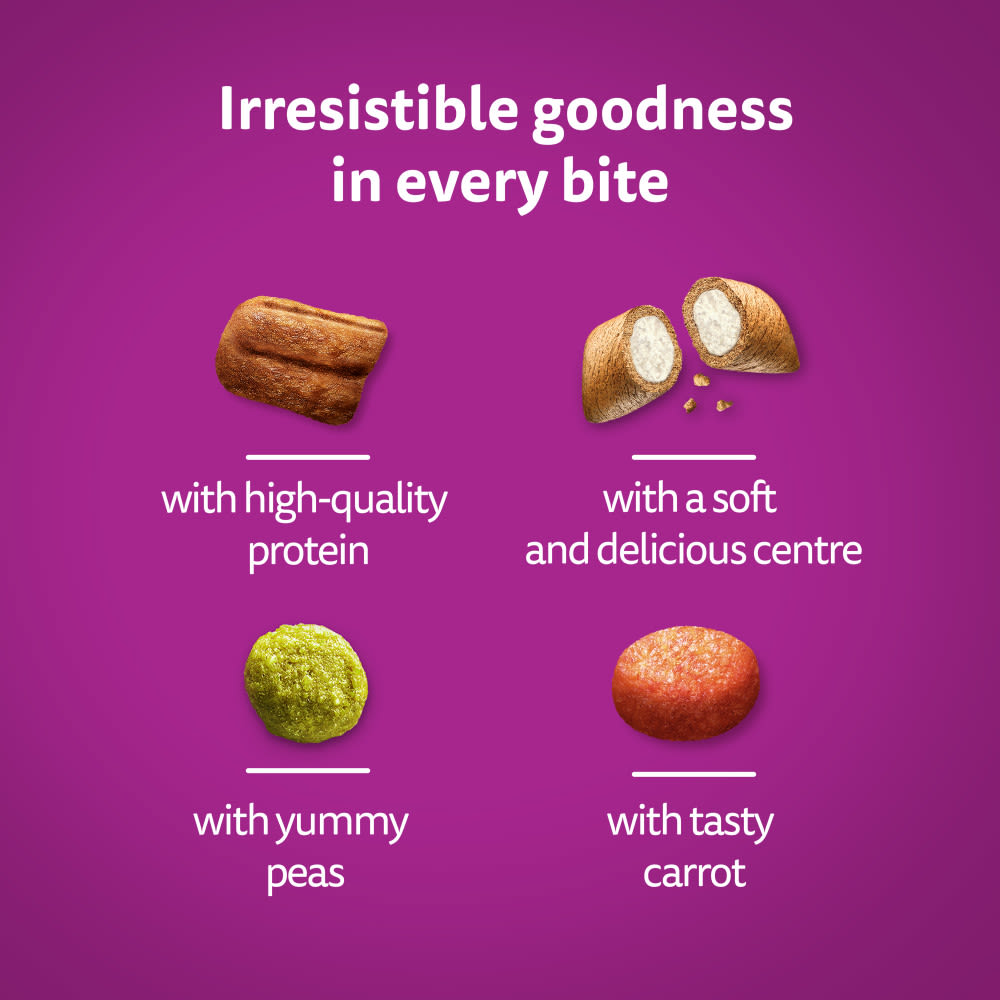 Cereals, Meat and Animal Derivatives, Derivatives of Vegetable Origin, Oils and Fats, Minerals, Fish and Fish Derivatives (including 4% Tuna in the Brown Kibbles*), Vegetable Protein Extracts, Various Sugars, Vegetables (including 0.5% Dried Carrots (equivalent to 4% Carrots) in the Orange Kibbles and 1% Dried Peas (equivalent to 4% Peas) in the Green Kibbles*), Yeast, *Brown Kibble typically 70% of product, Orange Kibble and Green Kibble both typically 8% of product each