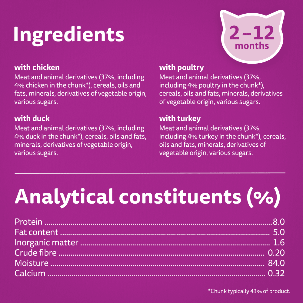 With Chicken Meat and Animal Derivatives (37%, including 4% Chicken in the Chunk*), Cereals, Oils and Fats, Minerals, Derivatives of Vegetable Origin, Various Sugars, *Chunk typically 43% of product With Duck Meat and Animal Derivatives (37%, including 4% Duck in the Chunk*), Cereals, Oils and Fats, Minerals, Derivatives of Vegetable Origin, Various Sugars, *Chunk typically 43% of product With Poultry Meat and Animal Derivatives (37%, including 4% Poultry in the Chunk*), Cereals, Oils and Fats, Minerals, Derivatives of Vegetable Origin, Various Sugars, *Chunk typically 43% of product With Turkey Meat and Animal Derivatives (37%, including 4% Turkey in the Chunk*), Cereals, Oils and Fats, Minerals, Derivatives of Vegetable Origin, Various Sugars, *Chunk typically 43% of product