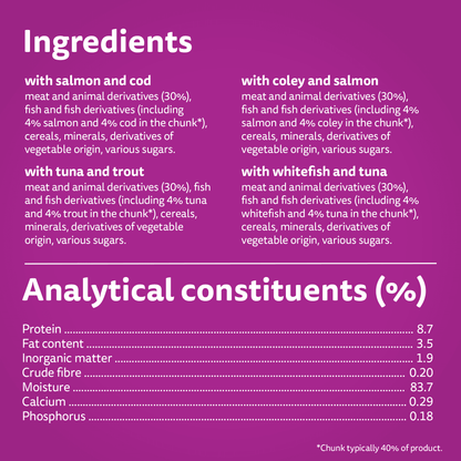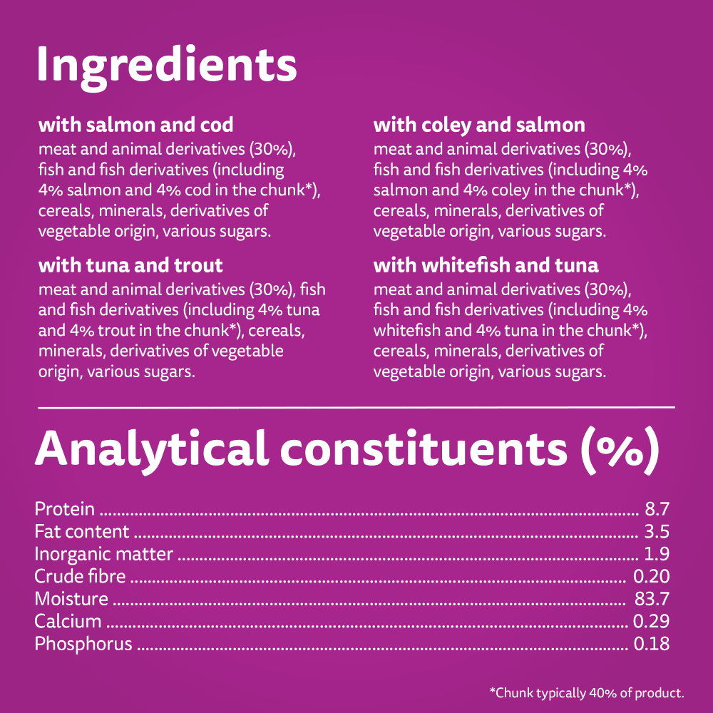 With Salmon and Cod Meat and Animal Derivatives (30%), Fish and Fish Derivatives (including 4% Salmon and 4% Cod in the Chunk*), Cereals, Minerals, Derivatives of Vegetable Origin, Various Sugars, *Chunk typically 40% of product With Tuna and Trout Meat and Animal Derivatives (30%), Fish and Fish Derivatives (including 4% Tuna and 4% Trout in the Chunk*), Cereals, Minerals, Derivatives of Vegetable Origin, Various Sugars, *Chunk typically 40% of product With Coley and Salmon Meat and Animal Derivatives (30%), Fish and Fish Derivatives (including 4% Salmon and 4% Coley in the Chunk*), Cereals, Minerals, Derivatives of Vegetable Origin, Various Sugars, *Chunk typically 40% of product With Whitefish and Tuna Meat and Animal Derivatives (30%), Fish and Fish Derivatives (including 4% Whitefish and 4% Tuna in the Chunk*), Cereals, Minerals, Derivatives of Vegetable Origin, Various Sugars, *Chunk typically 40% of product