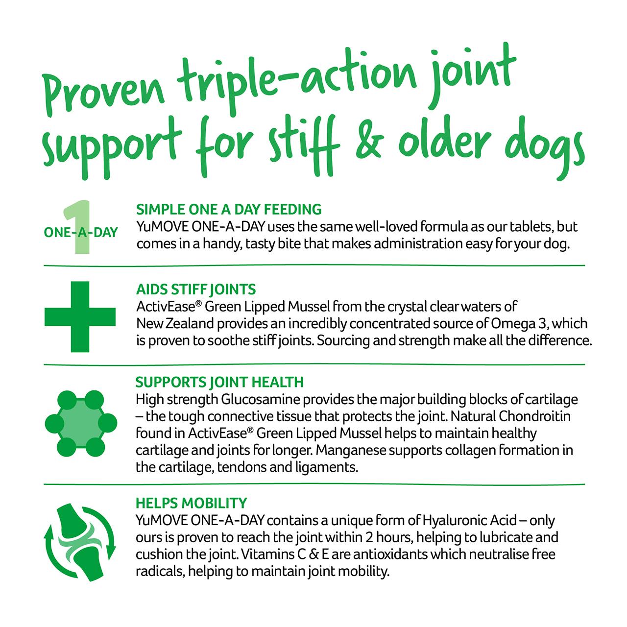 Give one a day to help your dog run, skip, jump and play. YuMOVE Joint Care One-a-day for Large Dogs works to keep your dog active for life in three ways – soothing stiff joints, supporting joint structure and helping mobility. The best part? You'll see visible results in just 6 weeks.*